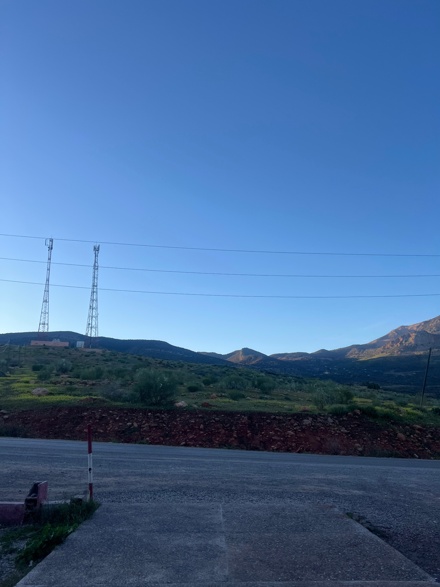The photograph captures a landscape scene in Ouaouizert, Morocco. Two transmission towers are visible against a clear blue sky. A mountain range runs along the horizon line. A concrete road with a red…read more