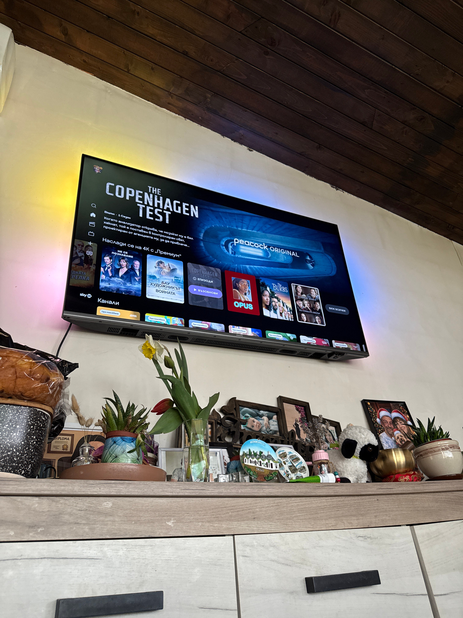 The image is of a television mounted on a wall in what appears to be an indoor setting. The TV is displaying a show titled "The Copenhagen Test," with various menu options visible on the screen. Adjac…read more