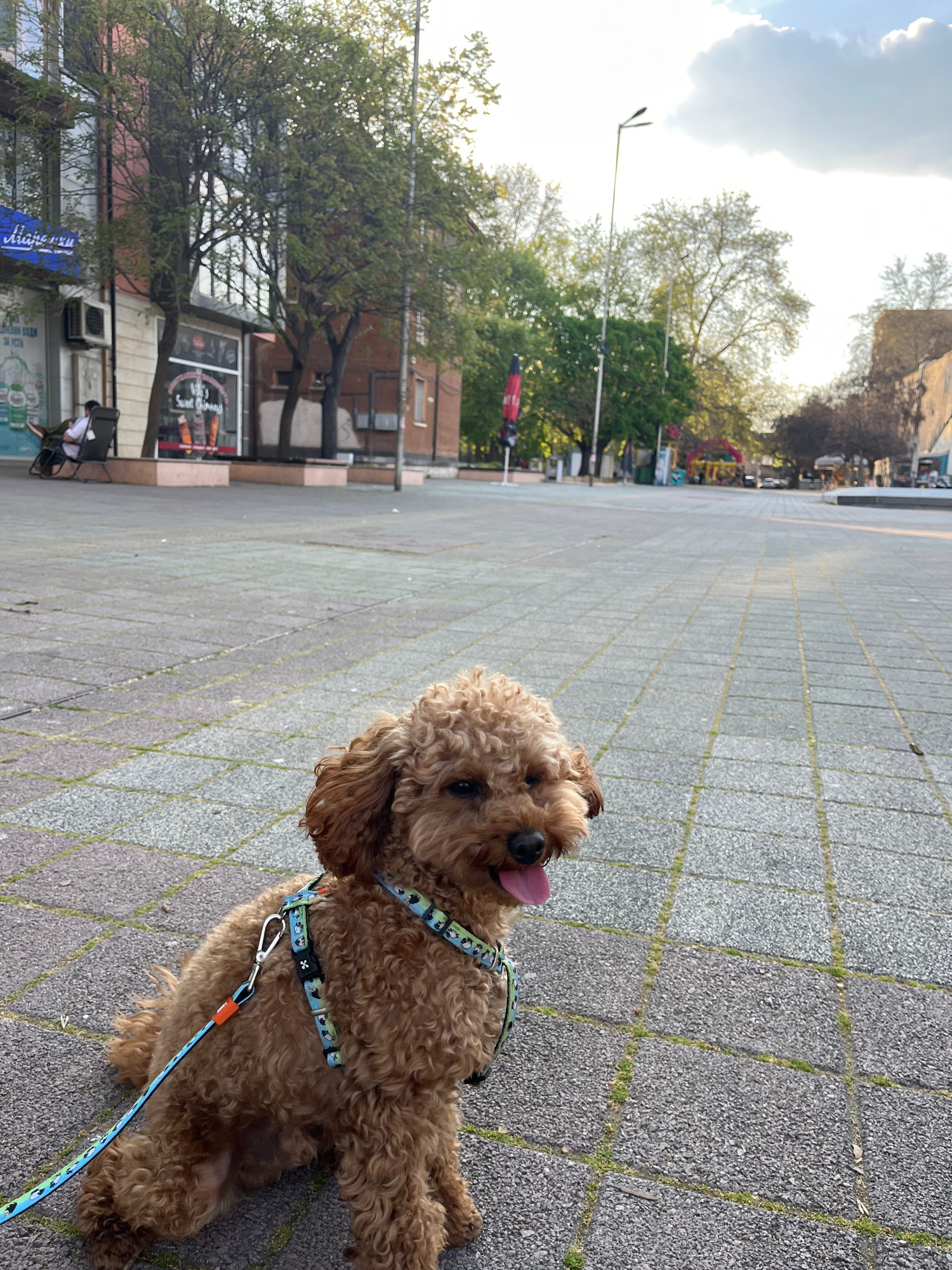 A reddish-brown poodle wearing a patterned blue and green harness and leash sits on a paved surface made of square blocks with green moss growing in the seams, likely in a public space. The dog is loo…read more