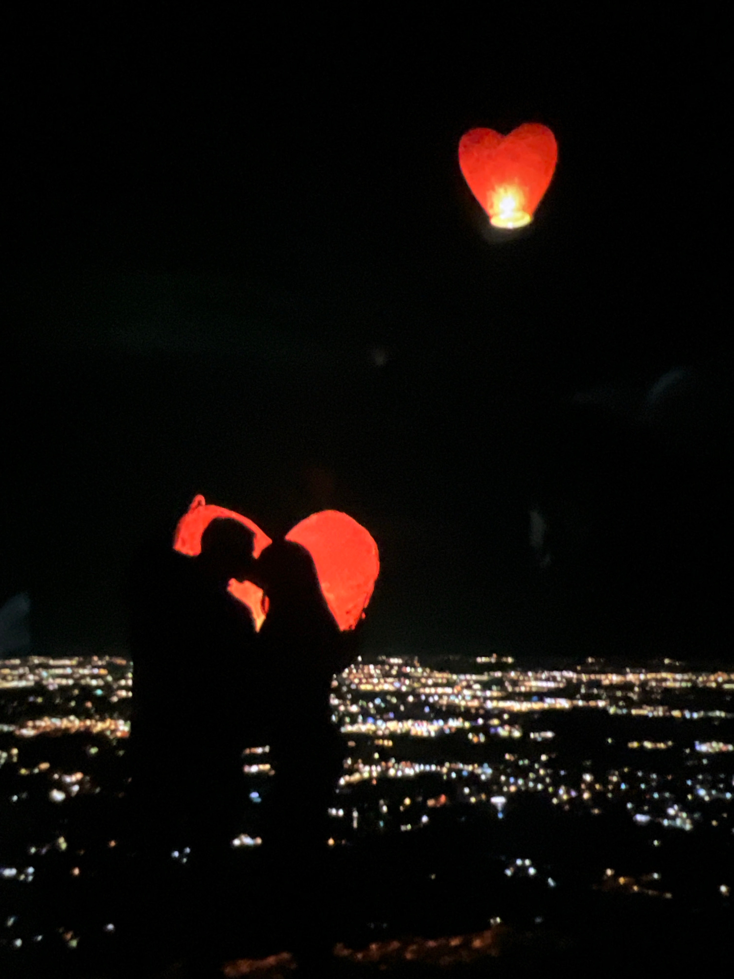 The image captures a dark scene at night, dominated by two glowing, red, heart-shaped objects. On the left, a single heart-shaped lantern or balloon floats against the black background, emitting a bri…read more