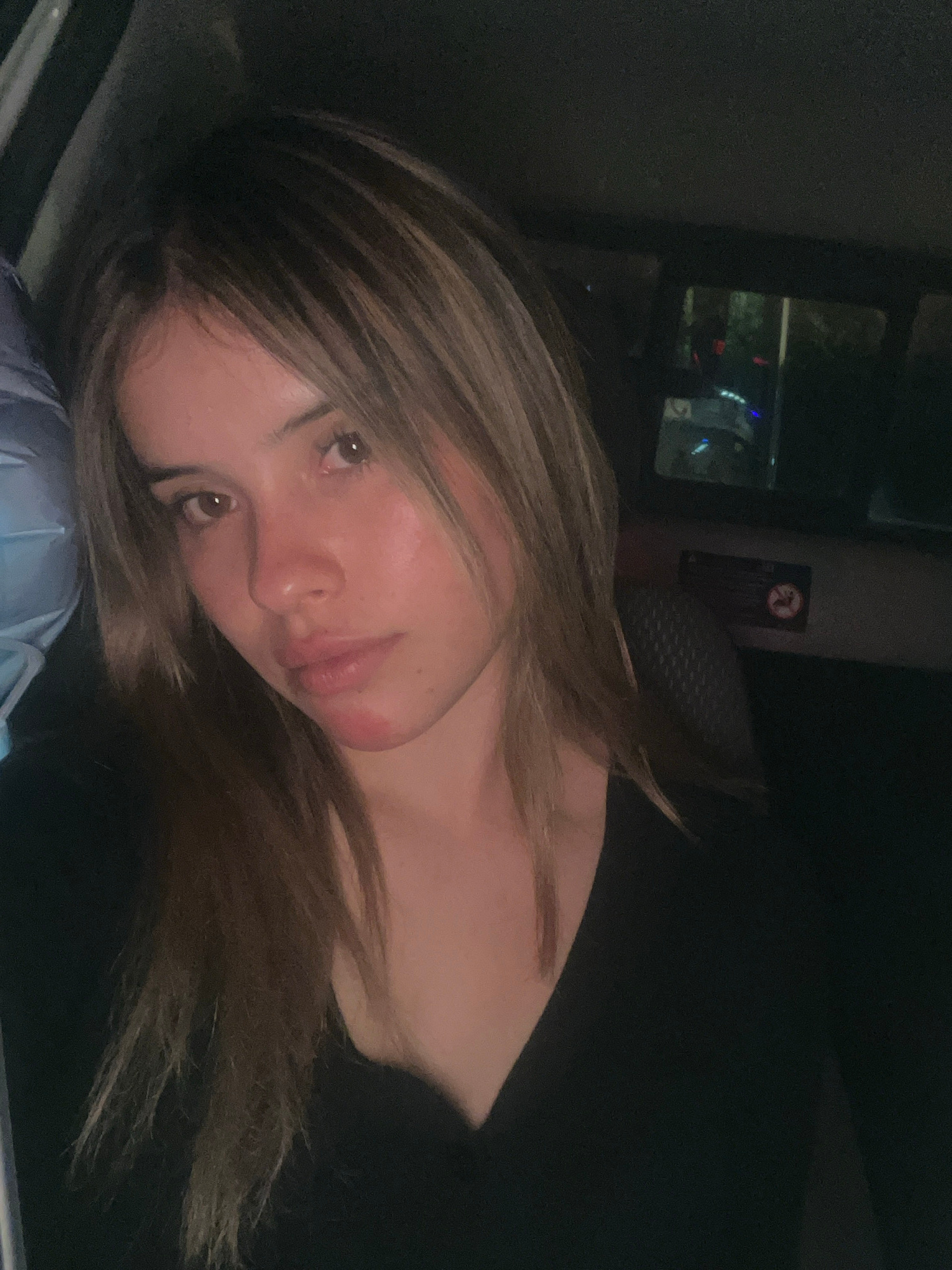 A woman with blonde and brown hair is lying on what appears to be a pillow or soft surface inside a vehicle. The background shows a dark interior with a window reflecting outside lights, possibly fromβ¦read more