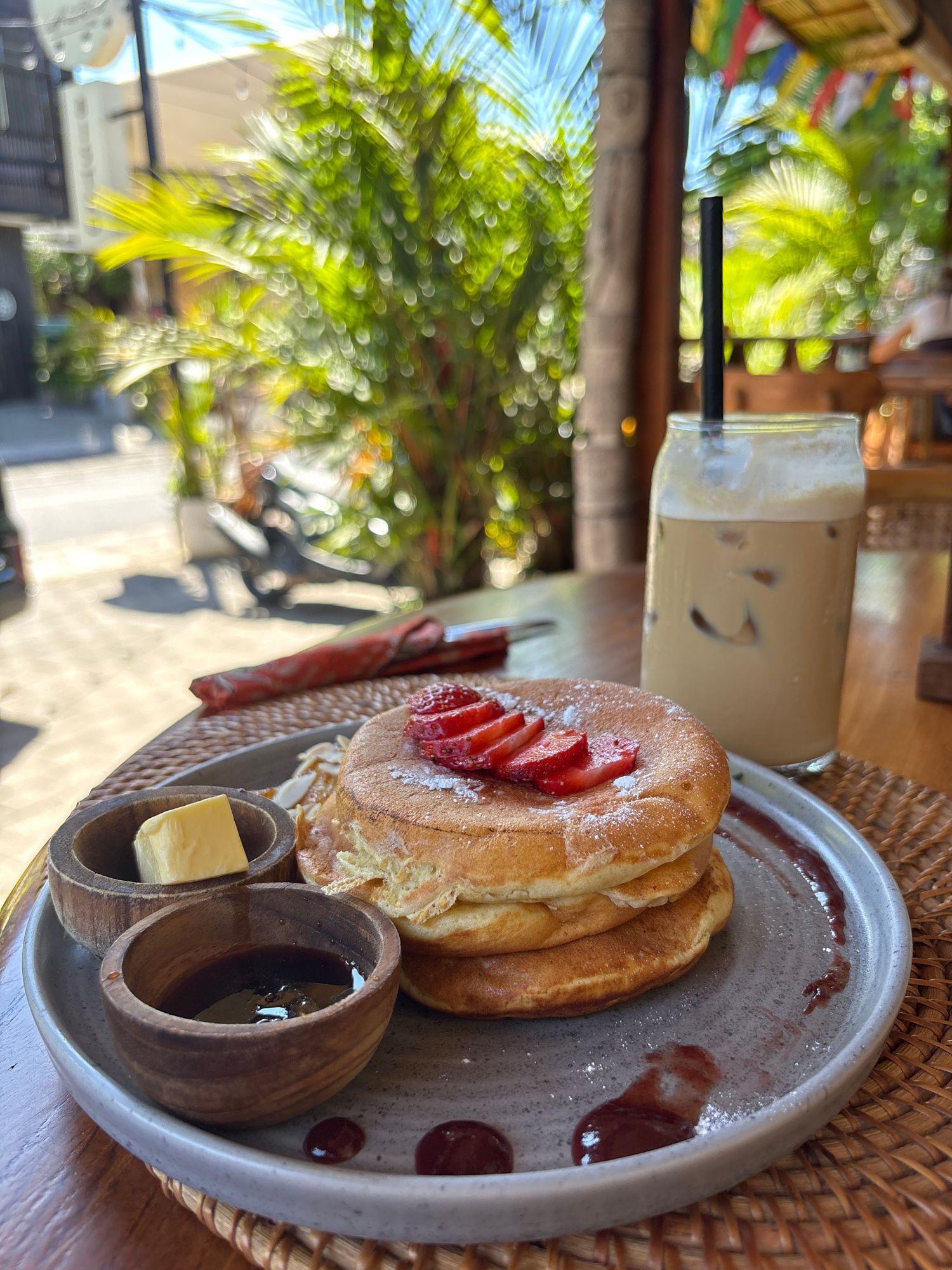 A breakfast scene is set outdoors in Pecatu, Indonesia, featuring pancakes and an iced coffee drink. The photograph is taken from an oblique, slightly downward angle. In the foreground, a stack of th…read more