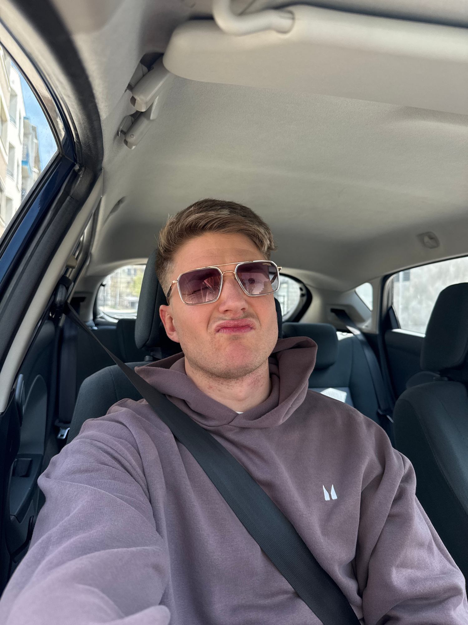A male is seated in the back seat of a car wearing sunglasses, a lavender hooded sweatshirt, and a seatbelt. The car's interior is visible, showing the headliner and window frame. Buildings are visibl…read more