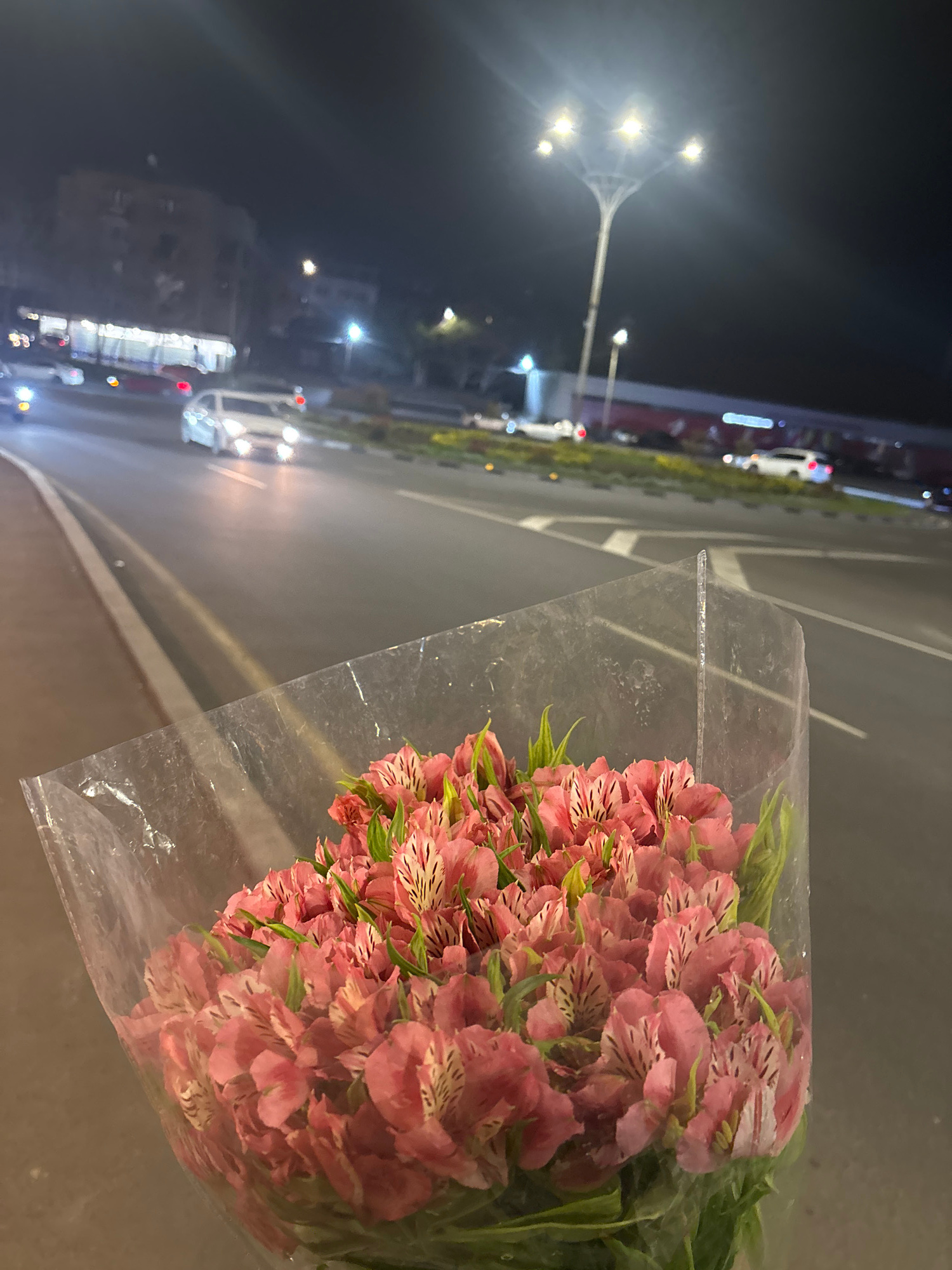 A bouquet of pink alstroemeria flowers wrapped in clear plastic sits on a surface at night in Yerevan, Armenia. A street stretches out from the right foreground into the background, where streetlights…read more