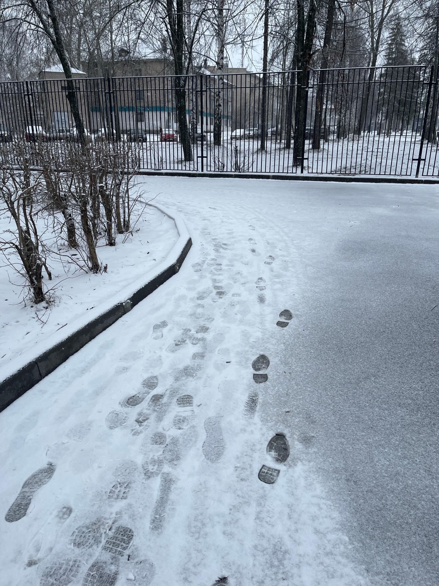 The image depicts a snow-covered area adjacent to a black metal fence and bare trees, likely in Chaikovsky, Russia. Footprints are visible in the snow, suggesting pedestrian traffic. A dark, raised bo…read more