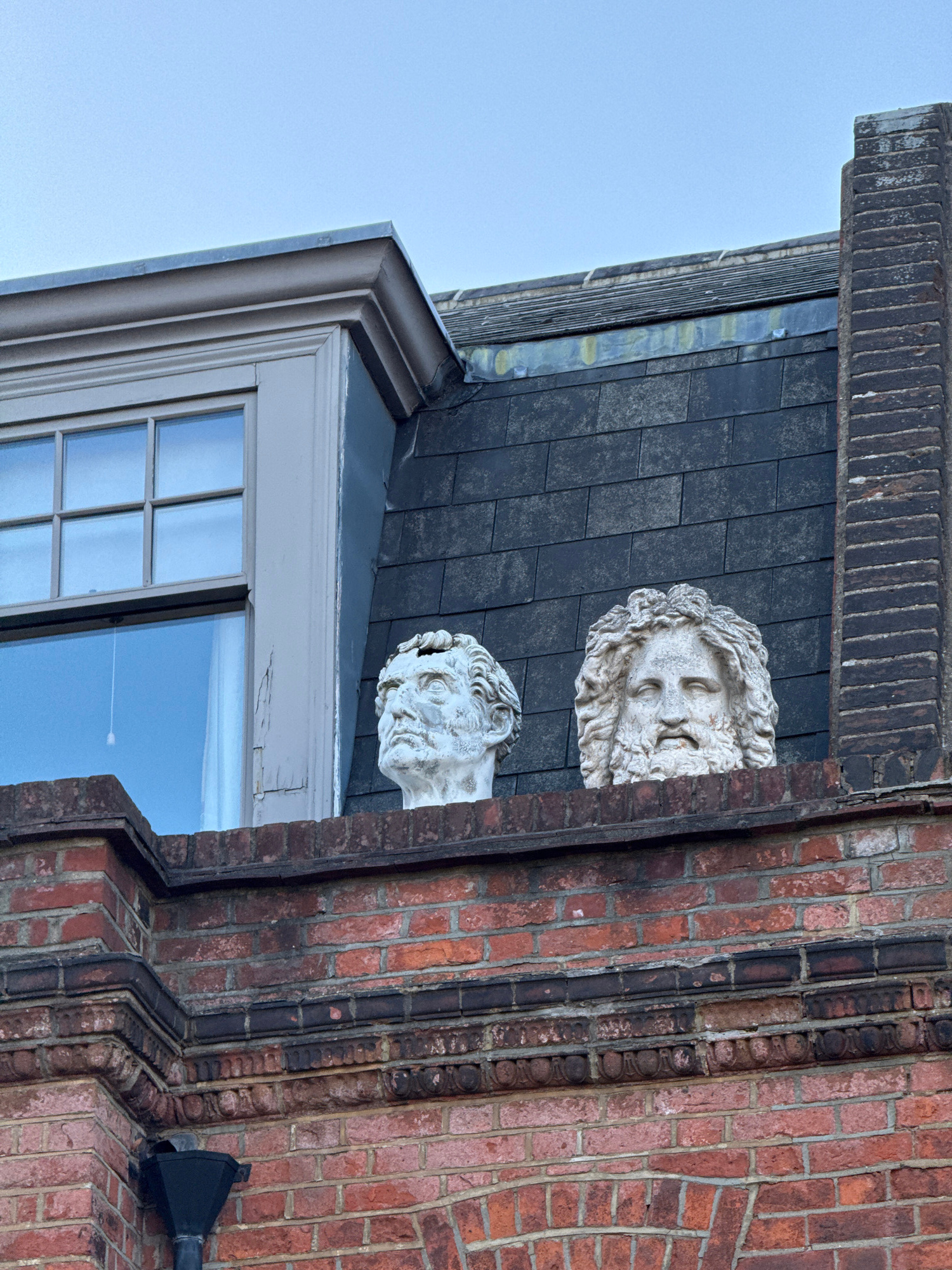 The image shows a partial view of a building in London, United Kingdom. The building exterior consists of brickwork, including red and dark bricks arranged in patterns, and slate tiles on a partial roβ¦read more