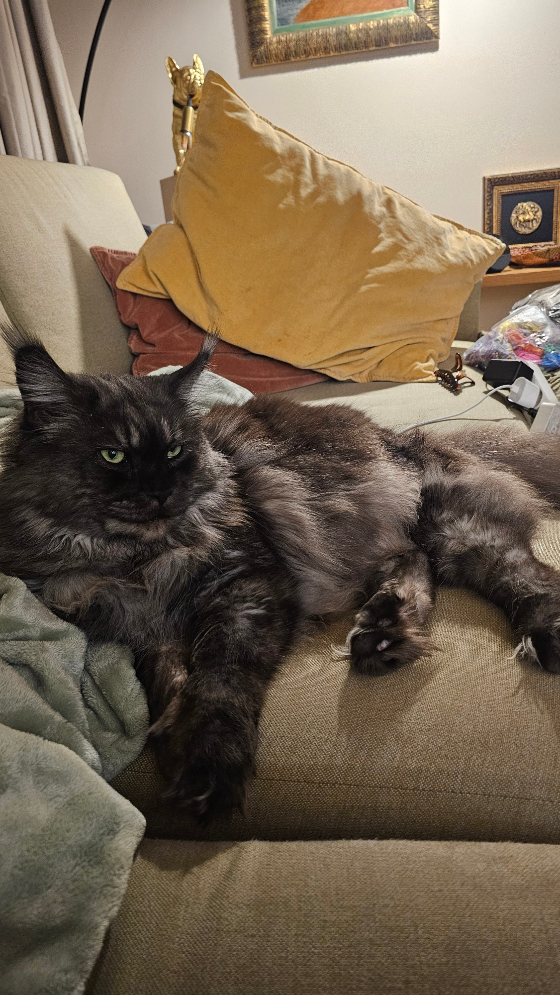 A long-haired, gray cat with green eyes is lying on a green couch. The cat is upside down, with its belly exposed. Next to the cat are pillows in shades of gold and rose. In the background, there are…read more