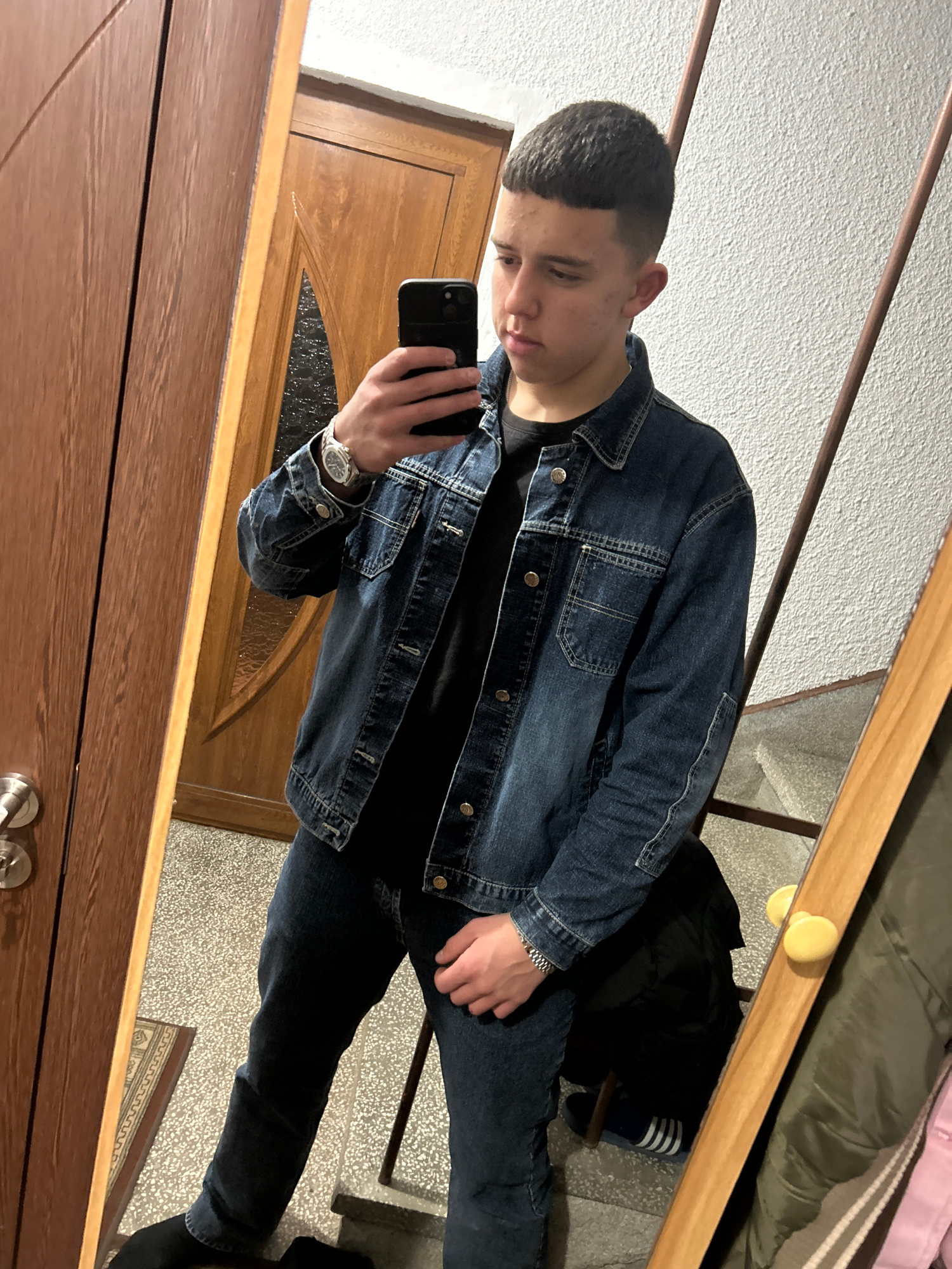 A young man is taking a selfie in a mirror indoors. He has short, dark hair and is wearing a denim jacket, a black shirt, dark jeans, and a watch on his left wrist. He holds a black smartphone in his…read more