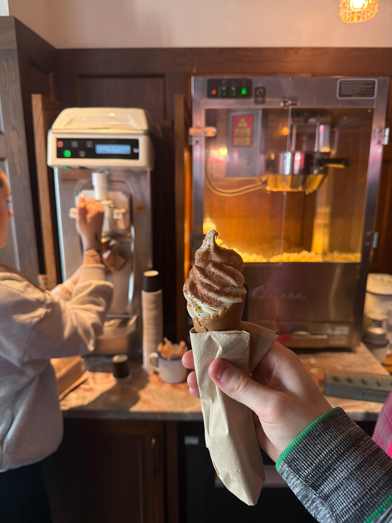 A person holds an ice cream cone in a paper wrapper, with a soft-serve ice cream dusted with cocoa. The image is set indoors, with kitchen appliances in the background. A popcorn machine stands tall,…read more