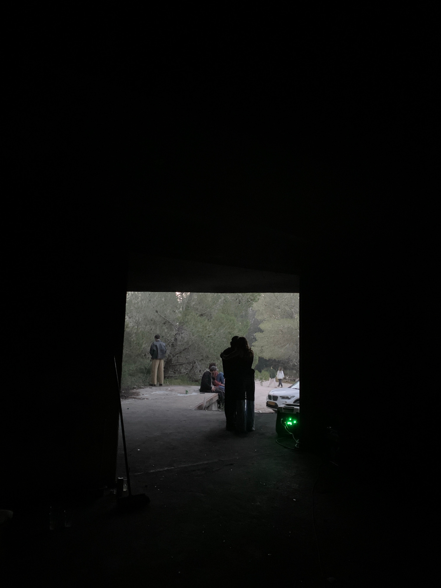 The image shows a view from a dark interior space, through an opening or doorway, onto a scene outdoors. Several people are visible in the outdoor area. One person is standing wearing khaki pants and…read more