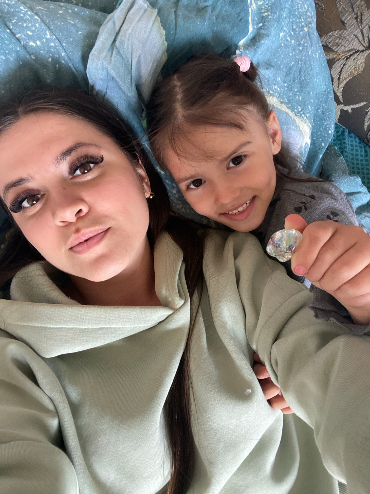 Two people, likely a mother and daughter, are lying close together on a patterned blue blanket. The daughter, wearing a grey top, is holding a clear, prism-like object in her hand. The mother is weari…read more