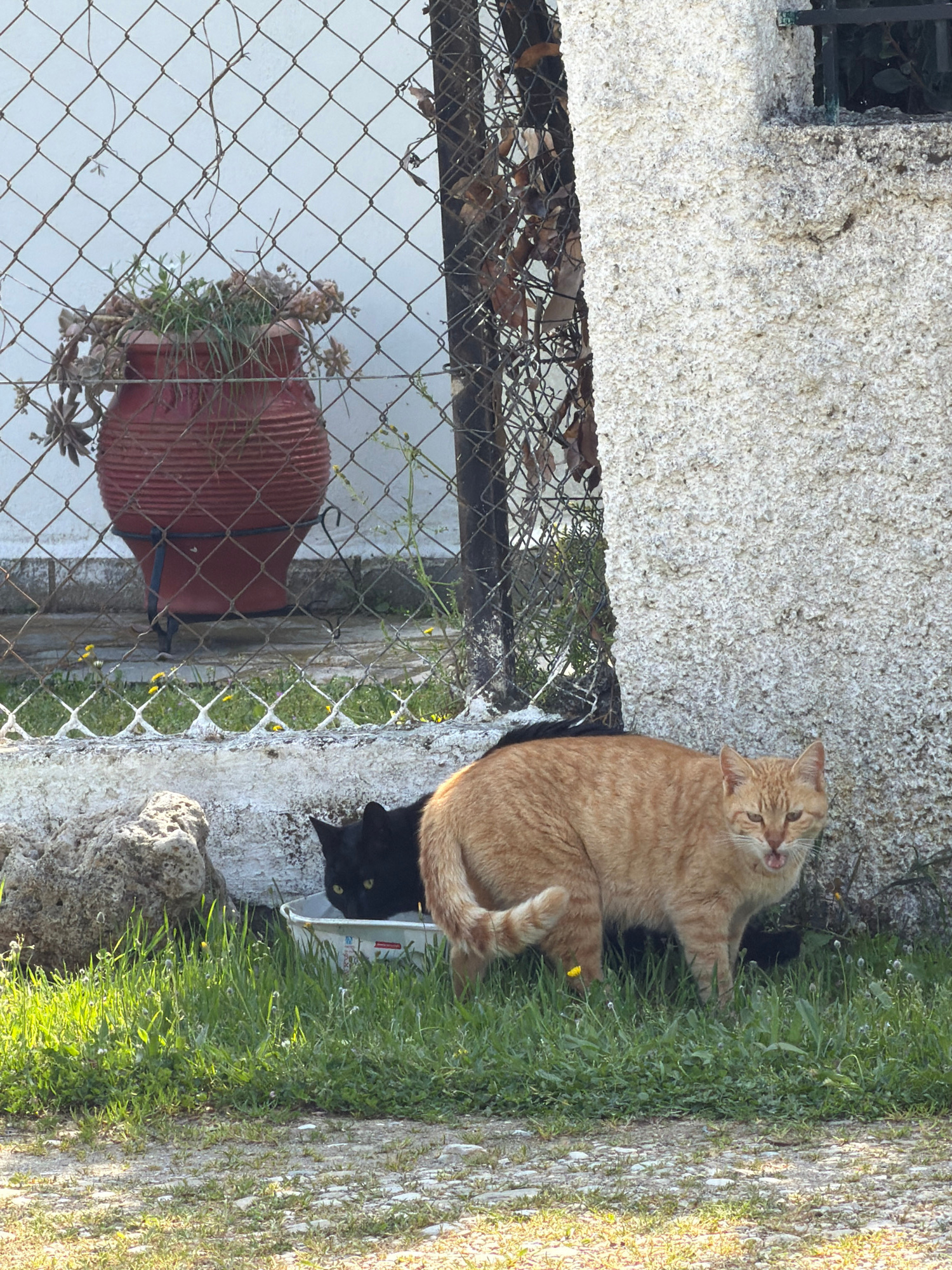Two cats are present in the image. One is an orange tabby lying near a concrete wall, while the other is a black cat peering out from behind it. There is green grass and other vegetation visible nearβ¦read more