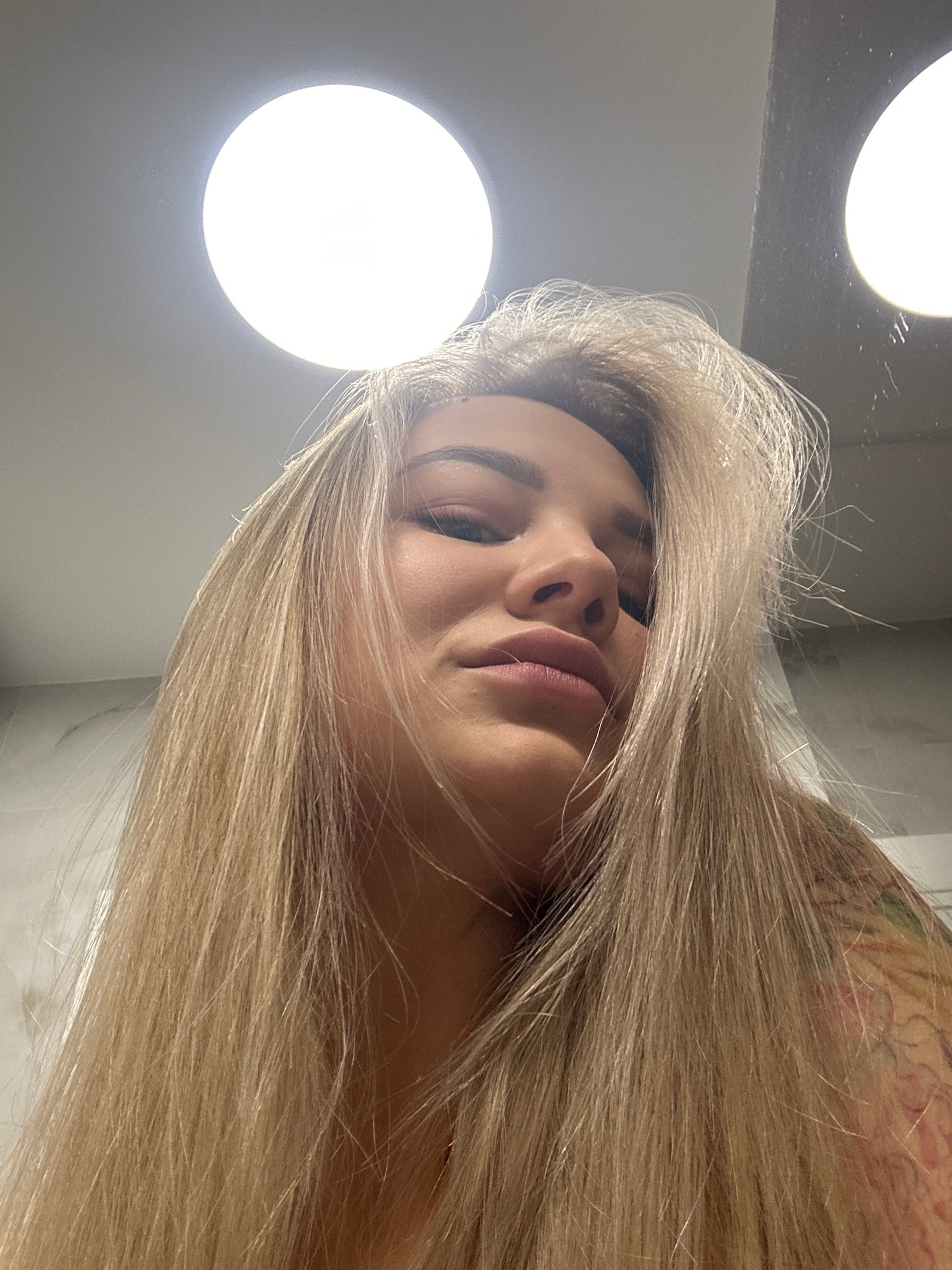 The image is a low-angle shot of a woman with long, light blonde hair. The woman's face is prominently featured, with her eyes partially closed and a slight tilt of her head. The lighting is bright, w…read more