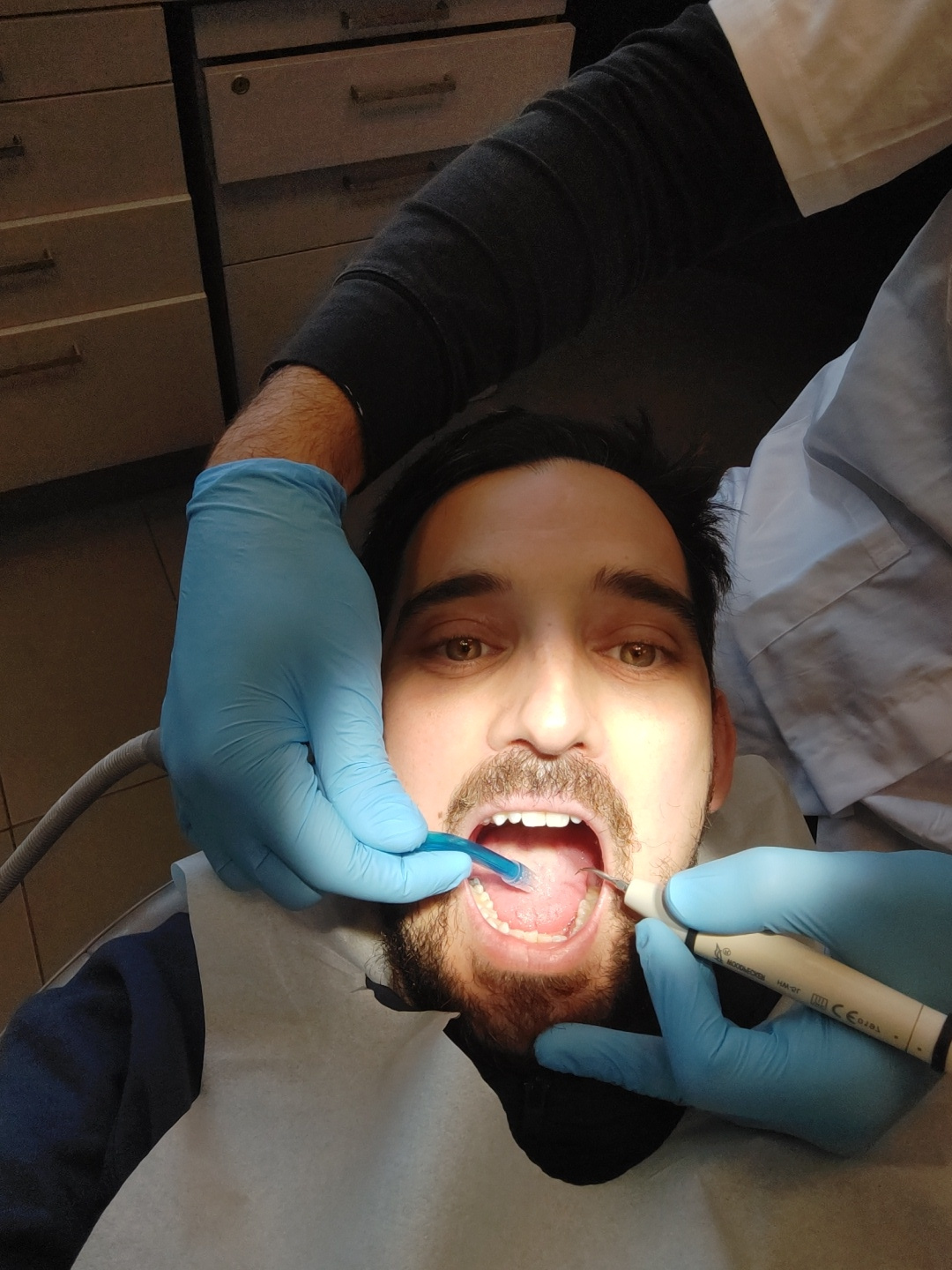 A dental hygienist is performing a dental cleaning on a male patient. The patient is lying in a dental chair with his mouth open. The hygienist is wearing blue gloves and using a dental scaler to remo…read more