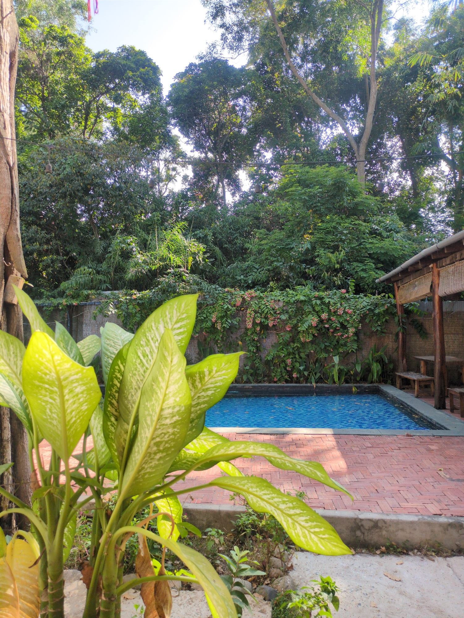 A verdant outdoor scene is captured in a horizontal orientation. A section of a swimming pool with blue tile is seen on the upper right, bordered by a red brick patio and grey concrete. A tropical pla…read more