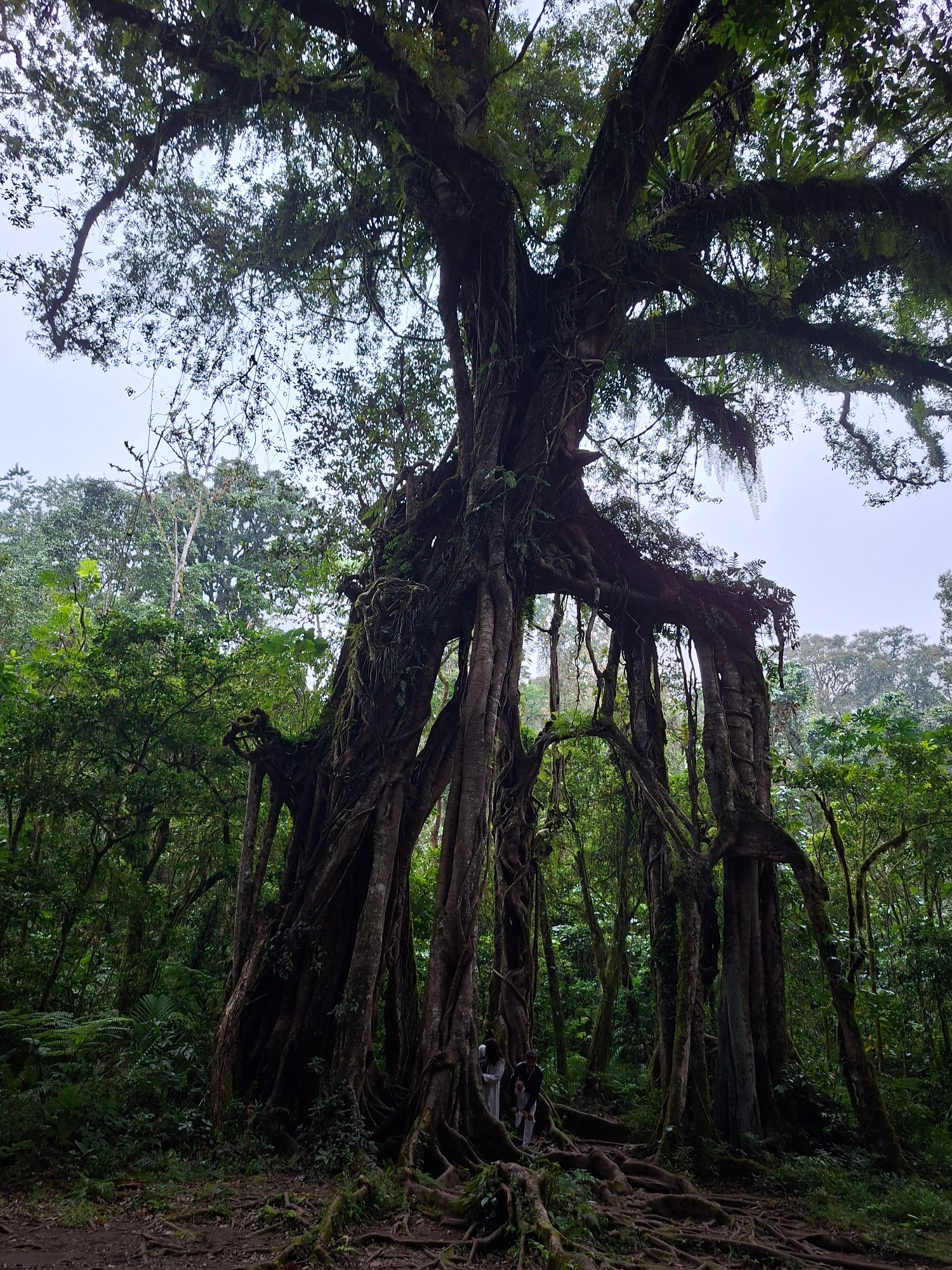 The image depicts a large, old banyan tree in a forest setting, likely in Baturiti, Indonesia. The tree's extensive aerial roots create a tunnel-like effect. Vegetation, including various trees and pl…read more