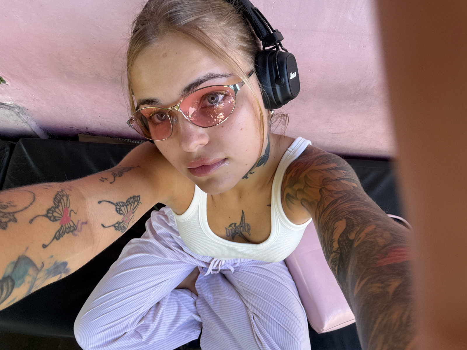 A young woman with tattoos on her arms and chest, wearing pink-tinted sunglasses and headphones, is lying on her back outdoors. She is wearing a white tank top and striped pajama pants. The ground app…read more