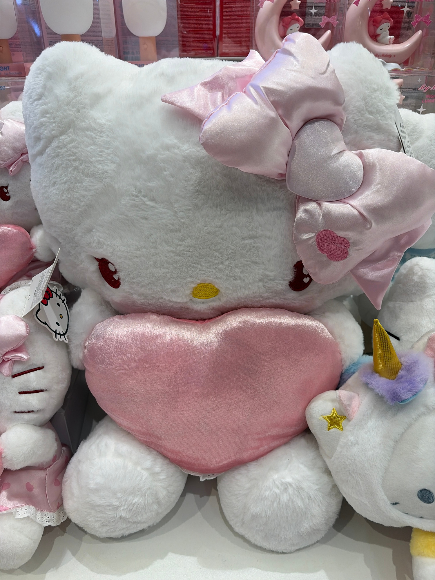 The image shows a collection of plush toys in a retail setting. The foreground is dominated by a large, white, fuzzy Hello Kitty plushie with a large pink bow on its head. The bow has a heart-shaped d…read more