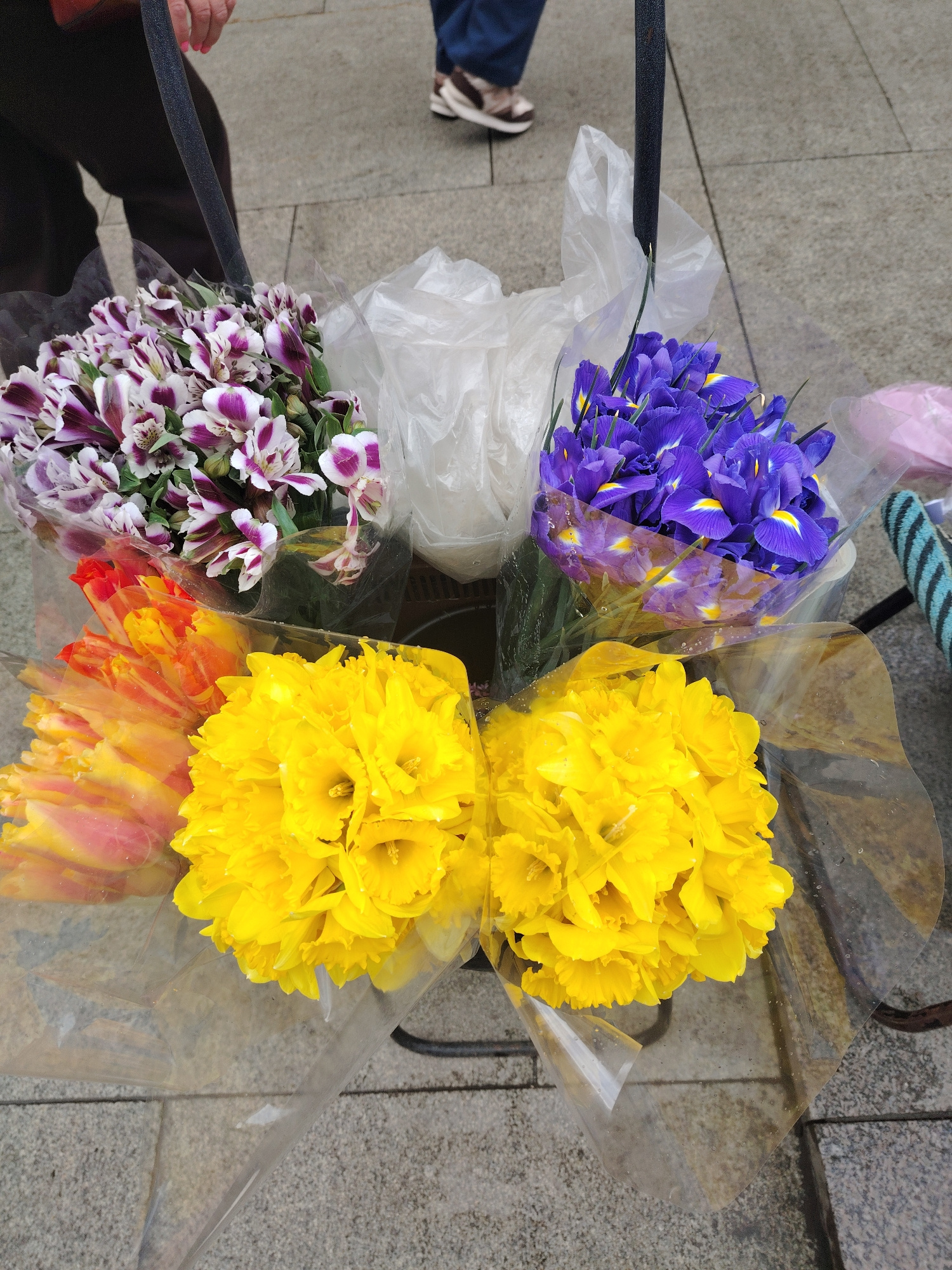The image shows a collection of four flower bouquets in individual plastic wraps arranged in a container, likely for sale. The bouquets consist of: purple and white alstroemeria, blue irises, orange t…read more