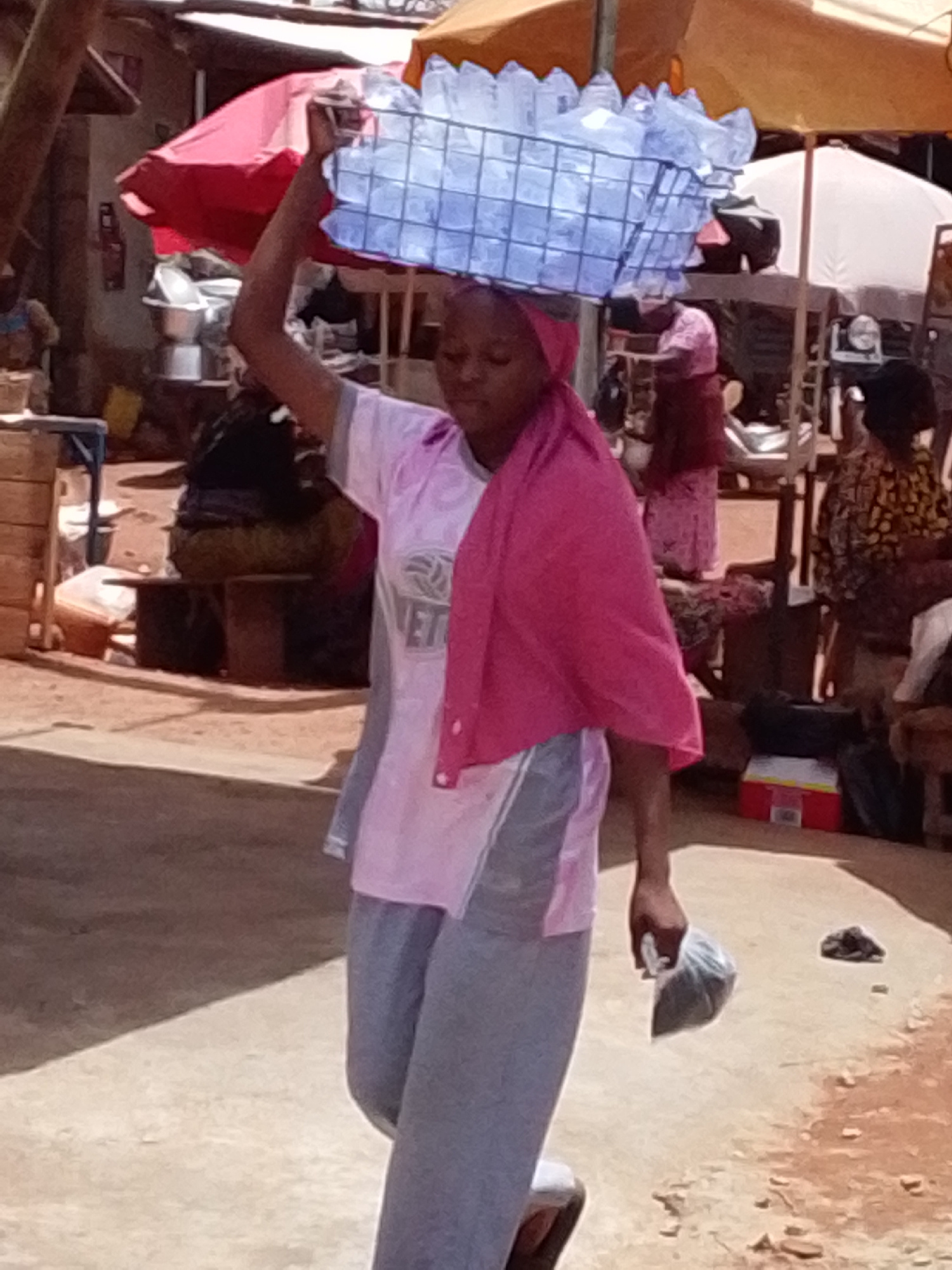 A woman in a pink headscarf and pink and gray clothing carries a wire basket filled with small plastic water bottles on her head in what appears to be a street in Tamale, Ghana. She is also holding a…read more