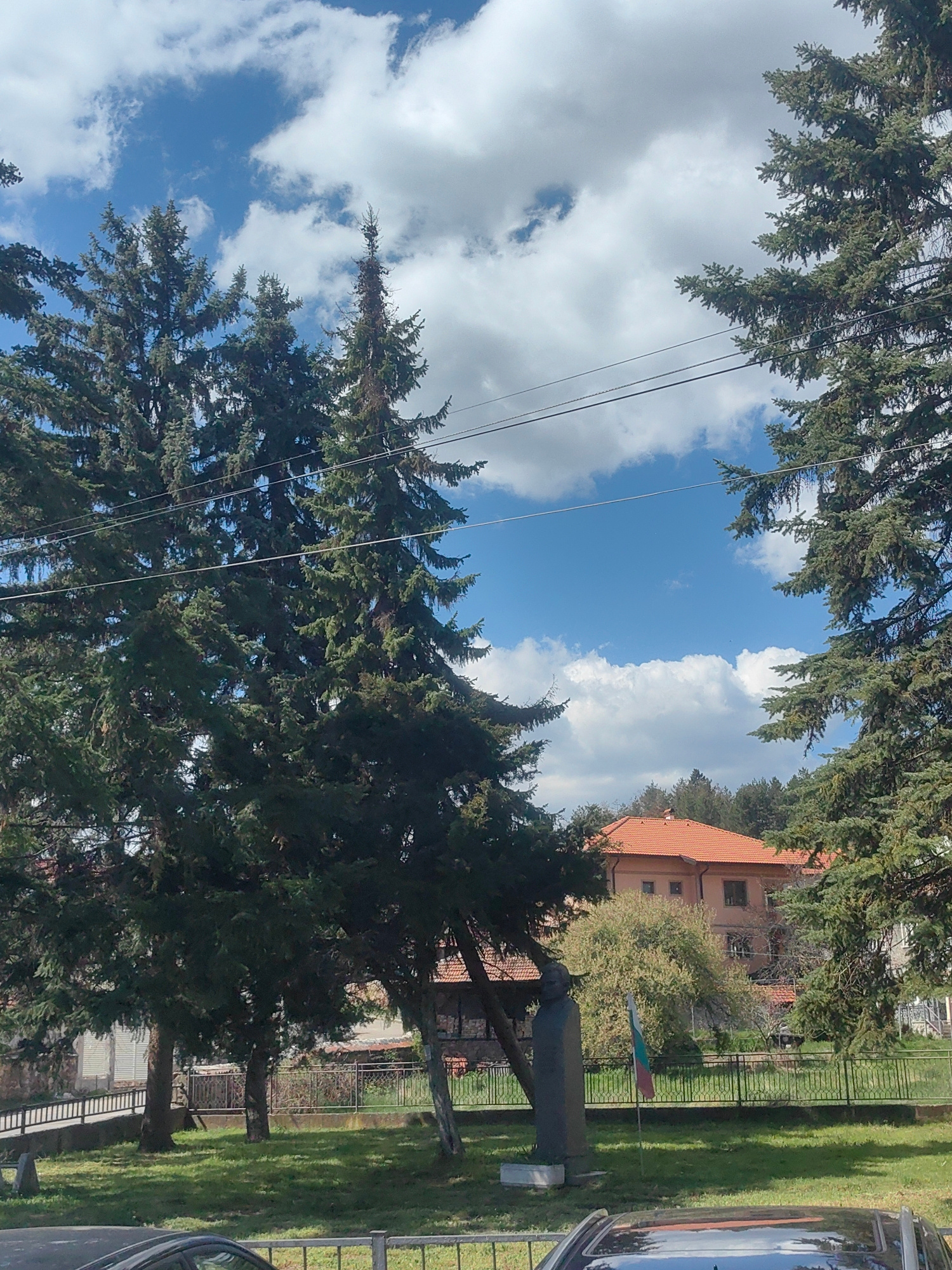 The image presents a view in Lokorsko, Bulgaria, featuring a building with a red tile roof partially obscured by tall evergreen trees, a statue, and a Bulgarian flag. The sky is visible between the tr…read more