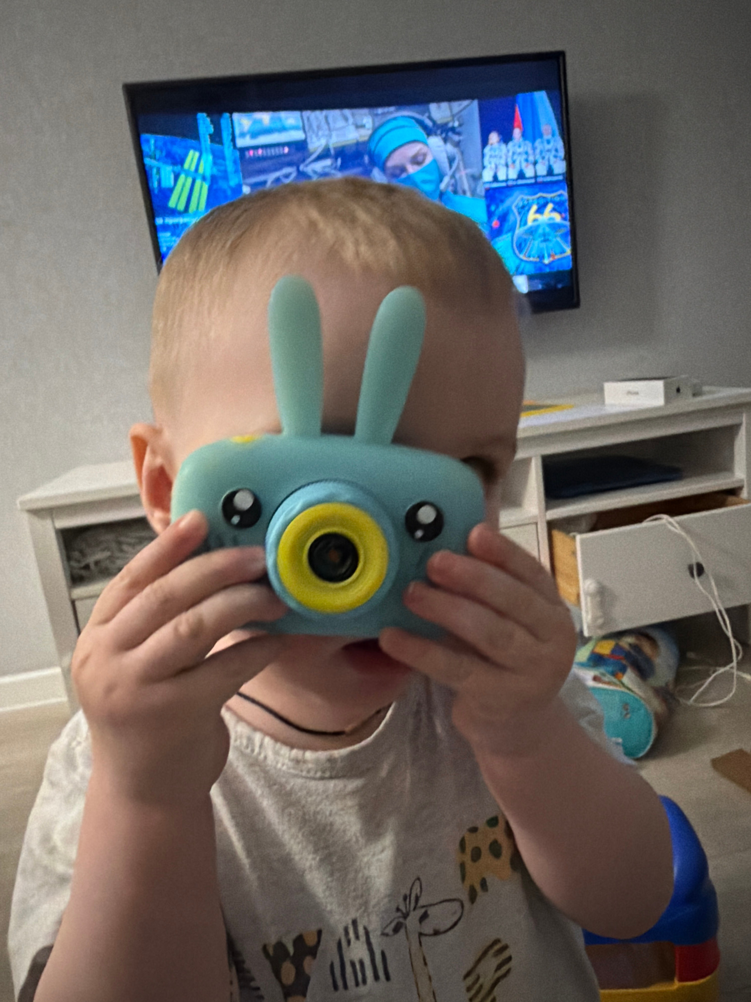 A child holds a toy camera with rabbit ears in front of his face. A television screen displays a video game. The background includes a cabinet and floor. It is not possible to confirm the location isβ¦read more