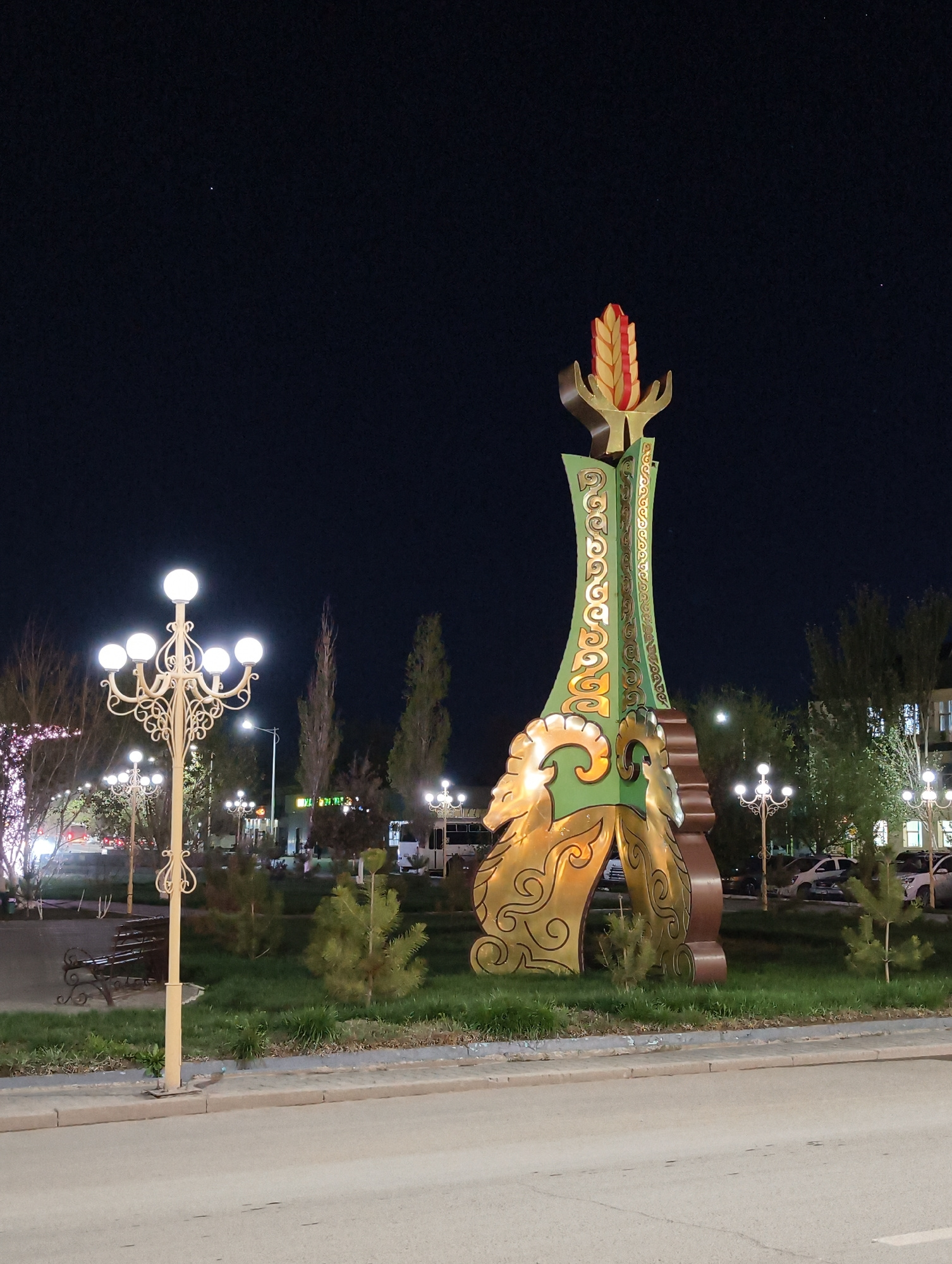 A nighttime scene depicts a large, illuminated monument in Kyzylorda, Kazakhstan. The monument, centrally located in a roundabout, features green and gold colors with ornate designs and a wheat stalk…read more