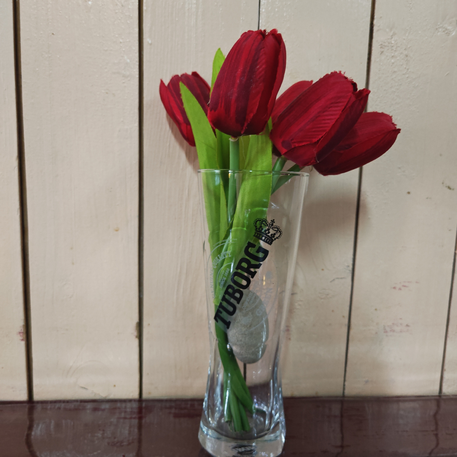 A glass vase with the "Tuborg" beer brand logo is positioned on a dark brown surface, presumably a table. The vase contains a bouquet of red tulips with green stems and leaves. The background is a lig…read more