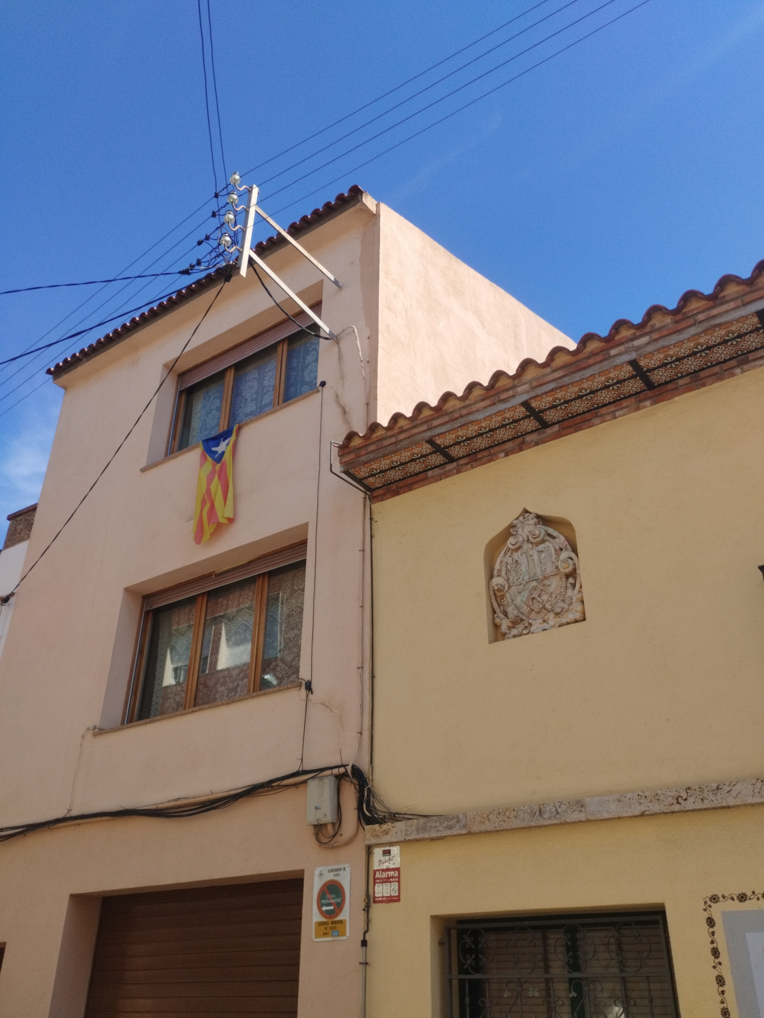 A low-angle shot captures the facades of two residential buildings under a bright, clear blue sky. The building on the left is a light pink or beige two-story structure with two prominent windows feat…read more