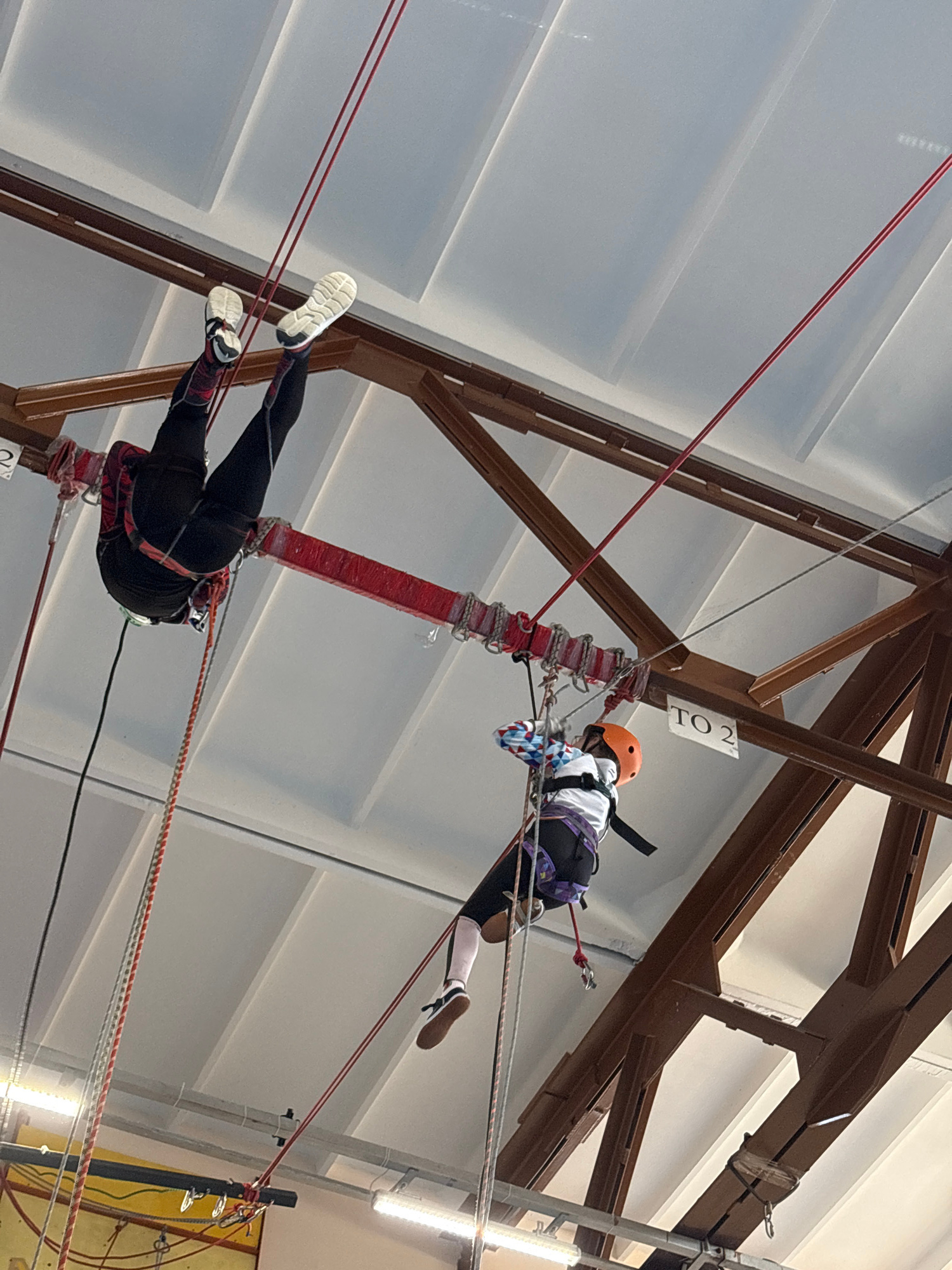The image depicts two individuals engaged in aerial acrobatics within an indoor space, possibly a gymnasium or training facility. The structure of the building is evident in the background. The locati…read more
