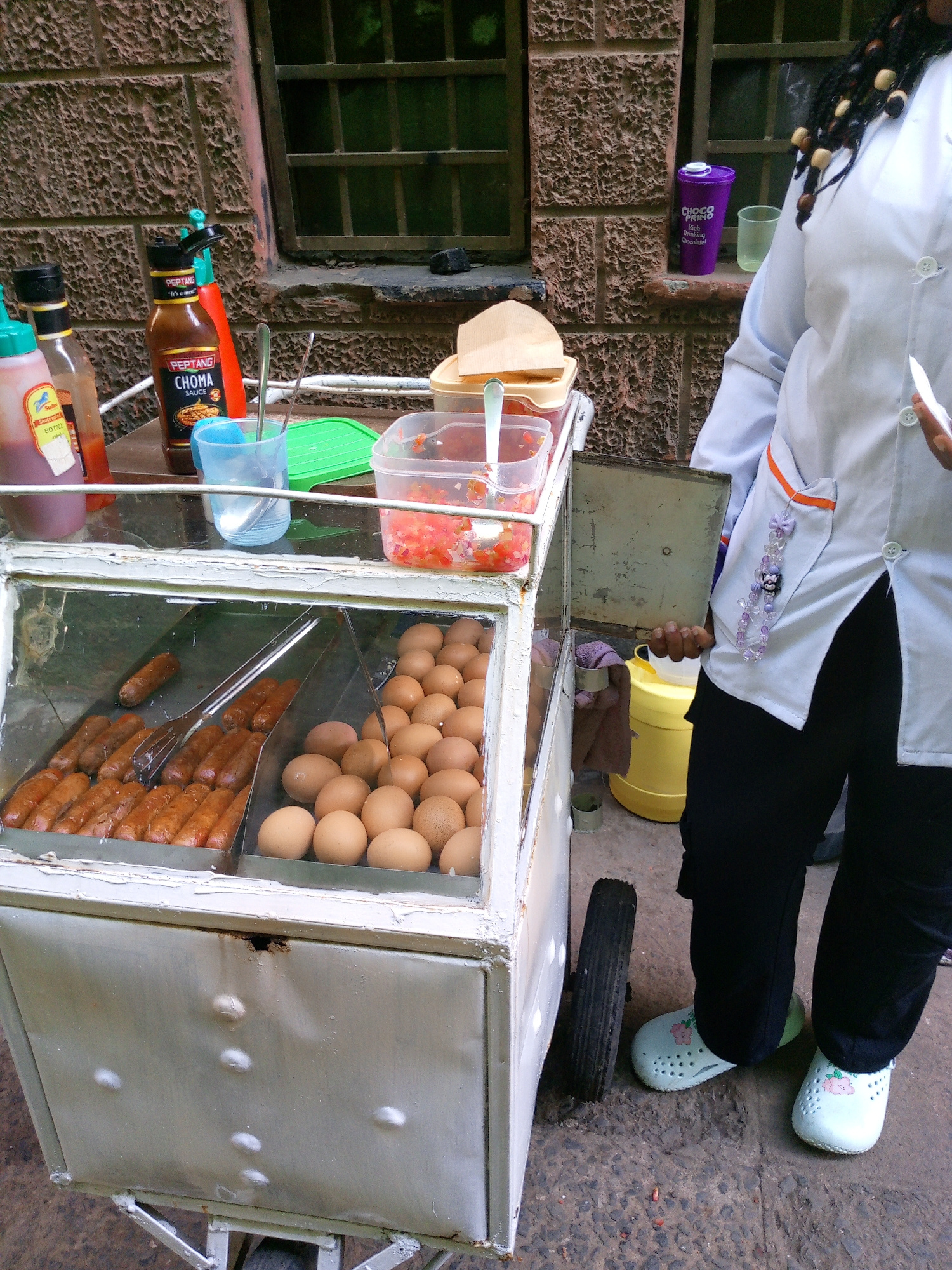 The image depicts an outdoor street food vending operation located against a textured reddish-brown brick building in Nairobi, Kenya. A partially visible individual stands to the right of a white meta…read more