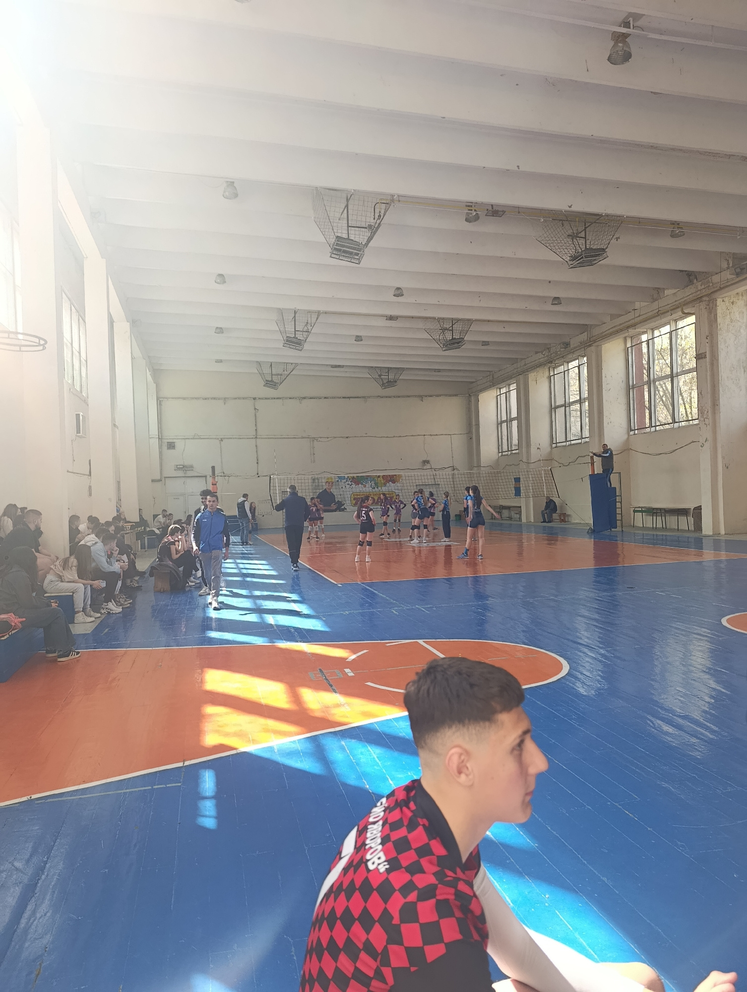 The image shows a volleyball game taking place in what appears to be a school gymnasium. The walls and ceiling are painted white, with metal cage-like structures hanging from the ceiling. Natural ligh…read more
