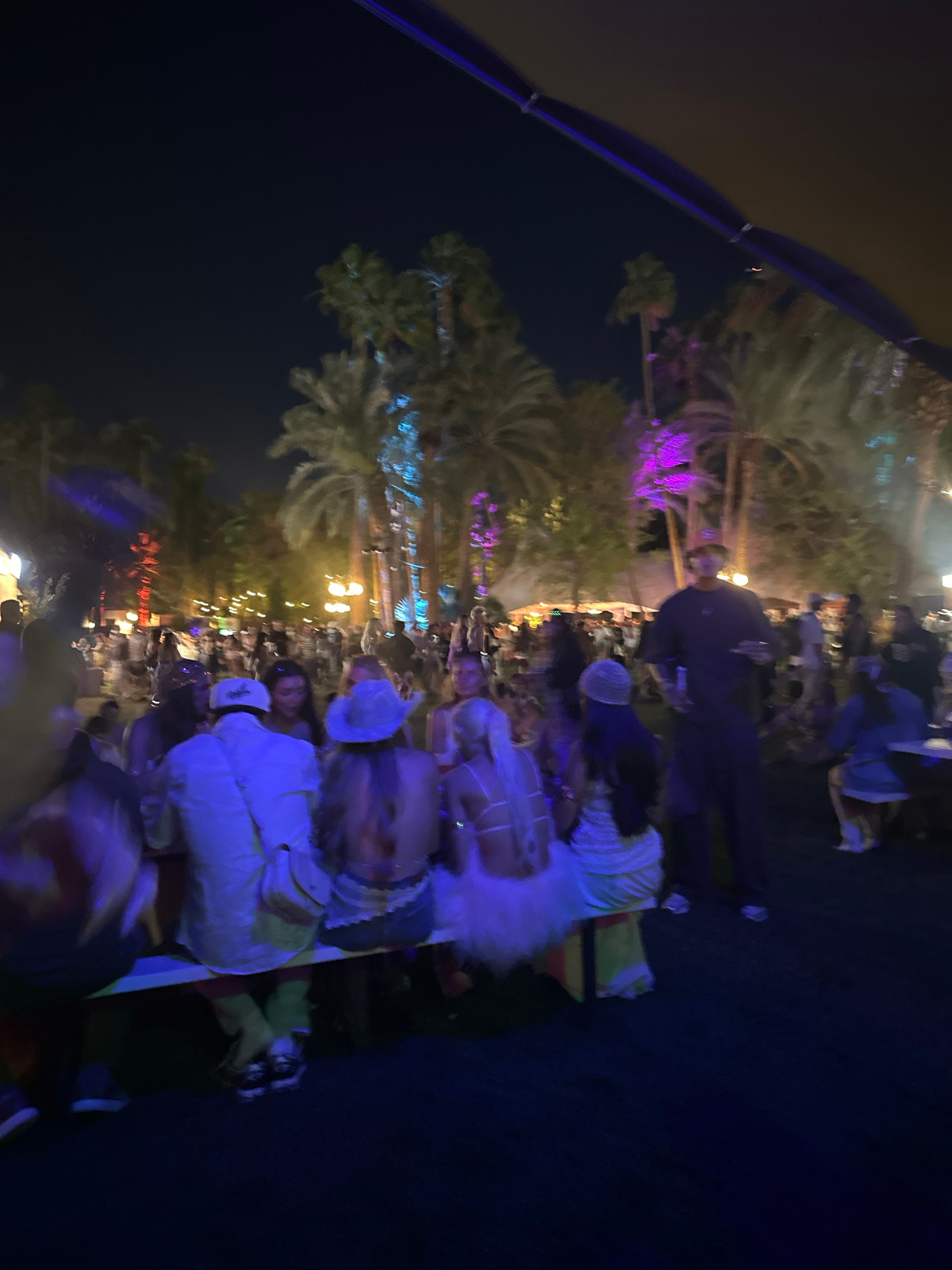 Here is a description of the image: The image depicts an outdoor event at night, possibly a party or gathering. A group of people are seen seated at tables under a canopy. Palm trees adorned with col…read more