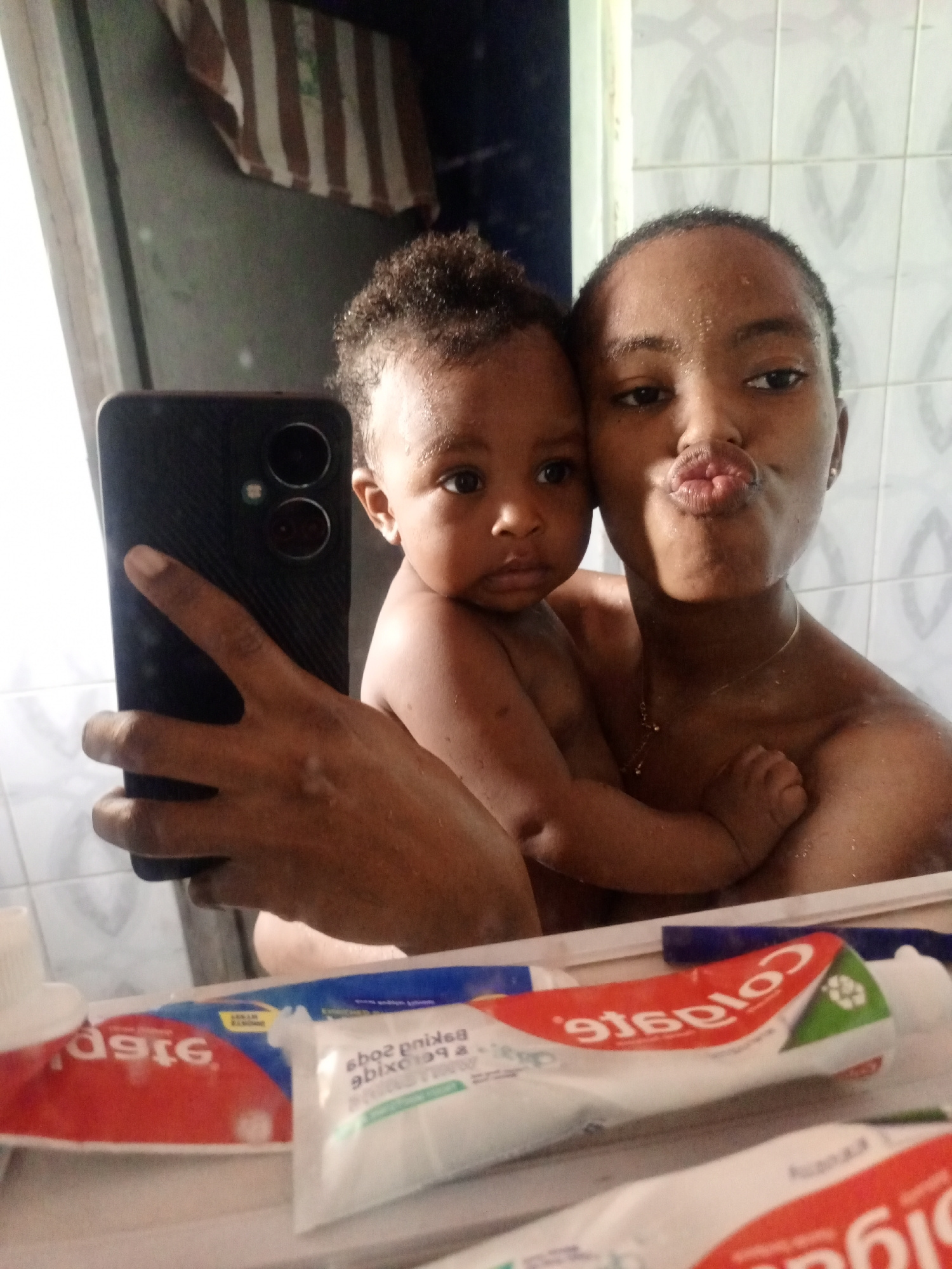 A person is taking a selfie in a bathroom mirror while holding a baby. The person is dark-skinned with short hair and is pouting her lips. The baby is also dark-skinned with curly hair. Two tubes of C…read more