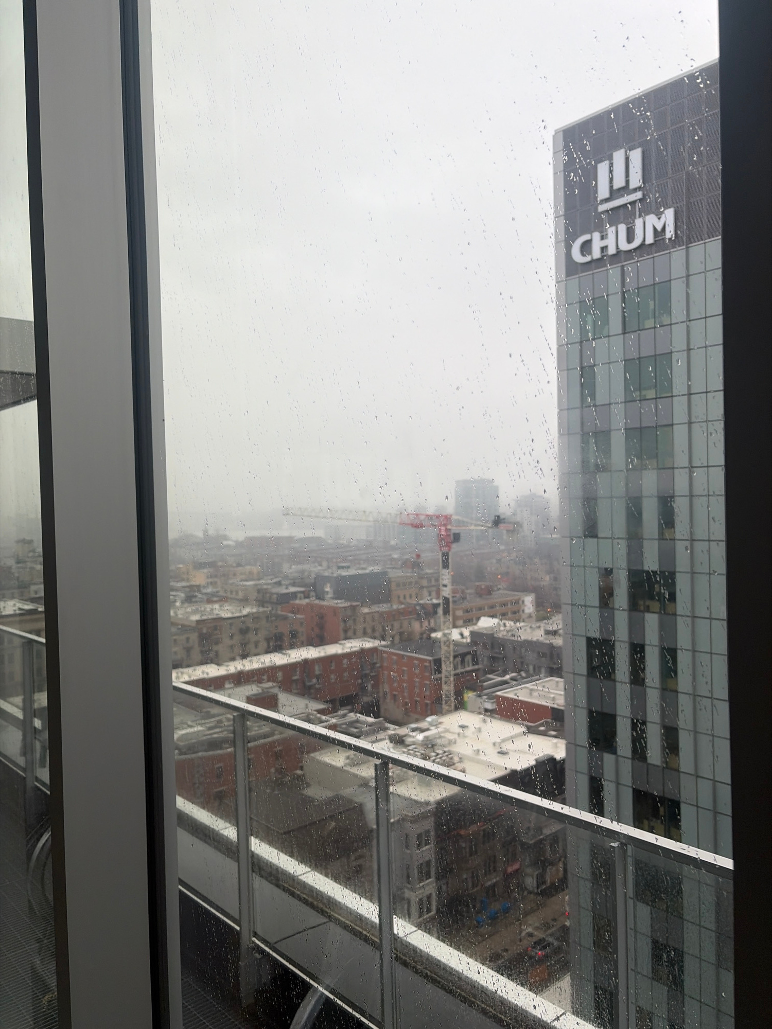 The image, captured from a high-rise window, presents an overcast and rainy day over a dense urban landscape, likely Montreal, Canada. The windowpane in the immediate foreground is covered in countles…read more