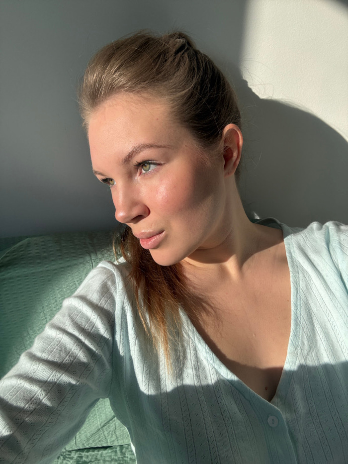 An indoor photograph features a female subject, depicted from the chest up, positioned within a residence in the city of Vozdovac Urban Municipality, Serbia. The subject has fair skin, green eyes, and…read more