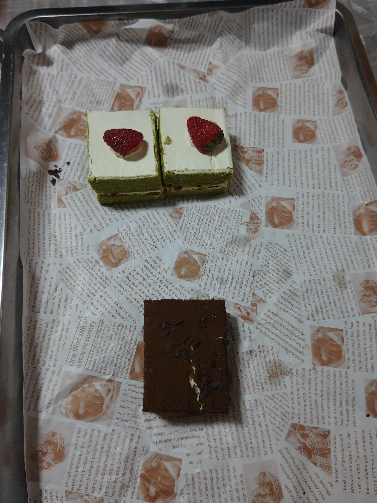 The image shows three slices of cake on a baking sheet lined with newspaper-print parchment paper. Two of the slices are green tea cake with white cream and topped with a strawberry. The third slice i…read more