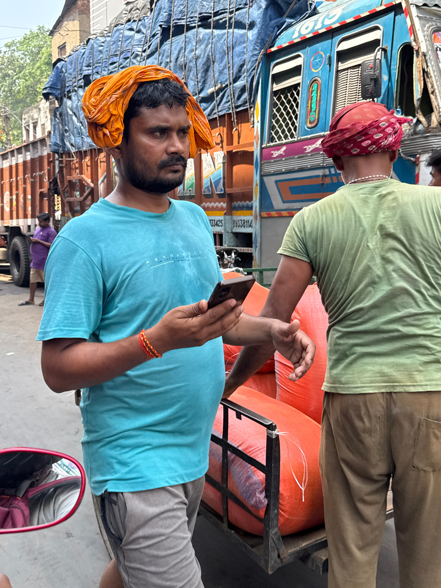 The image shows two men in Kolkata, India, near a truck. One man, wearing a blue t-shirt and an orange head covering, is looking at a mobile phone. The other man, with a red head covering and a green…read more