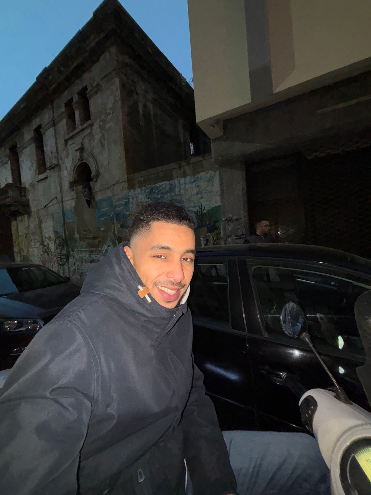 A man in a black jacket is standing near a black car. The background shows an old building with damaged walls, possibly in a state of disrepair. The scene suggests an urban setting at night. It's diff…read more