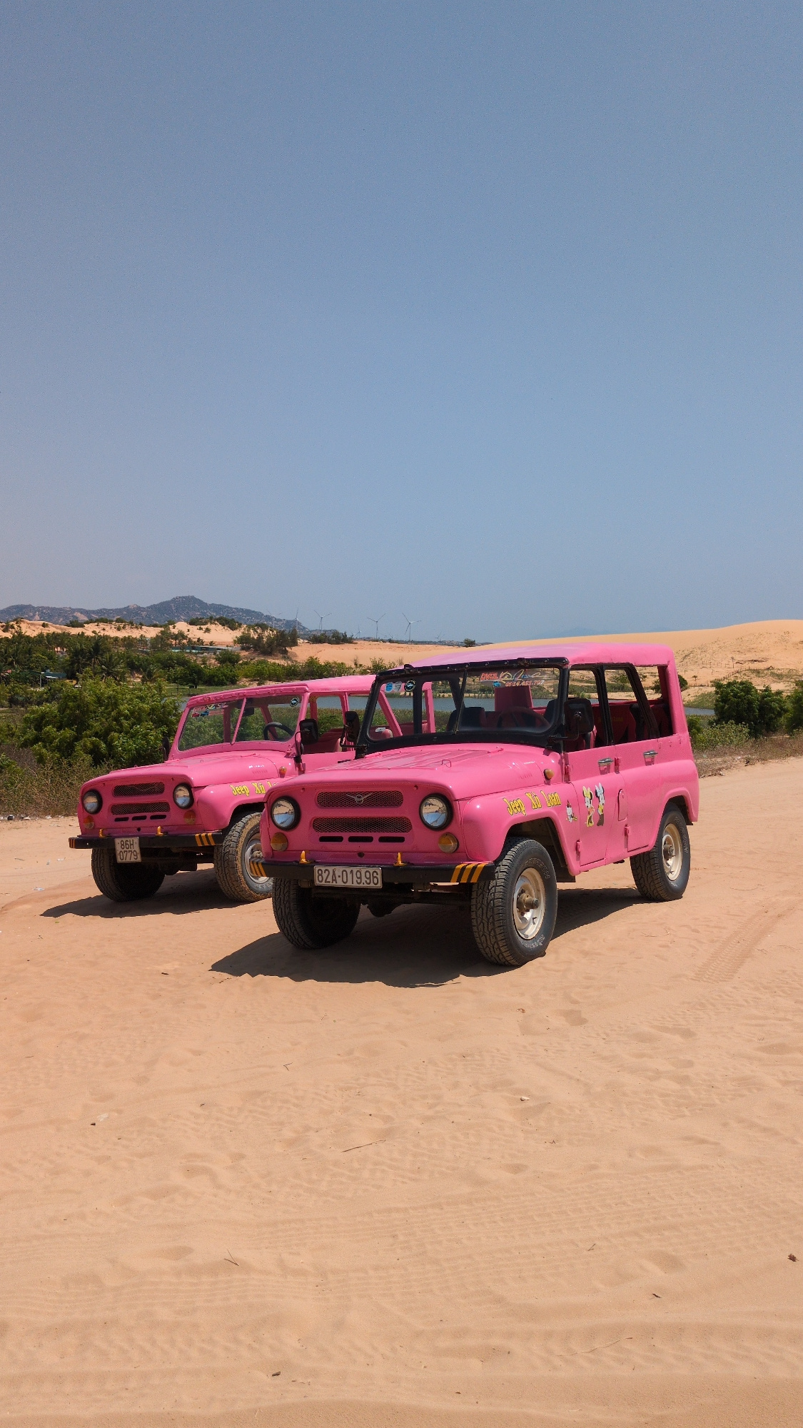 A medium shot depicts two pink jeeps parked on sand dunes under a clear blue sky. In the background, greenery and more sand dunes are visible. The license plate on the foreground jeep reads "82A-013.9…read more