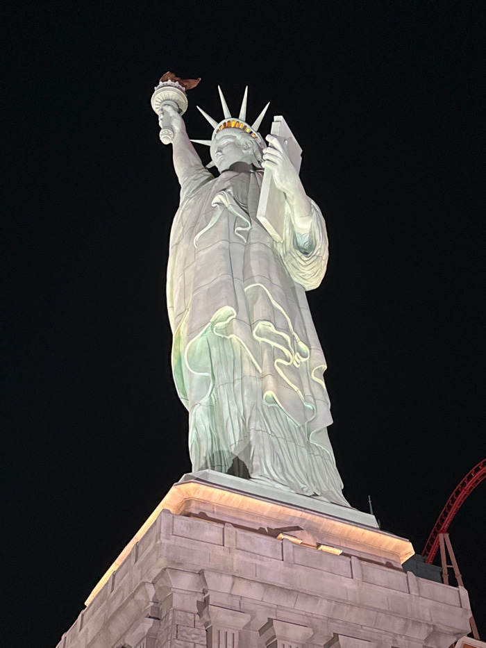 The image captures a large-scale replica of the Statue of Liberty, illuminated at night, presented horizontally across the frame as if lying on its side. The background is entirely black, indicating n…read more
