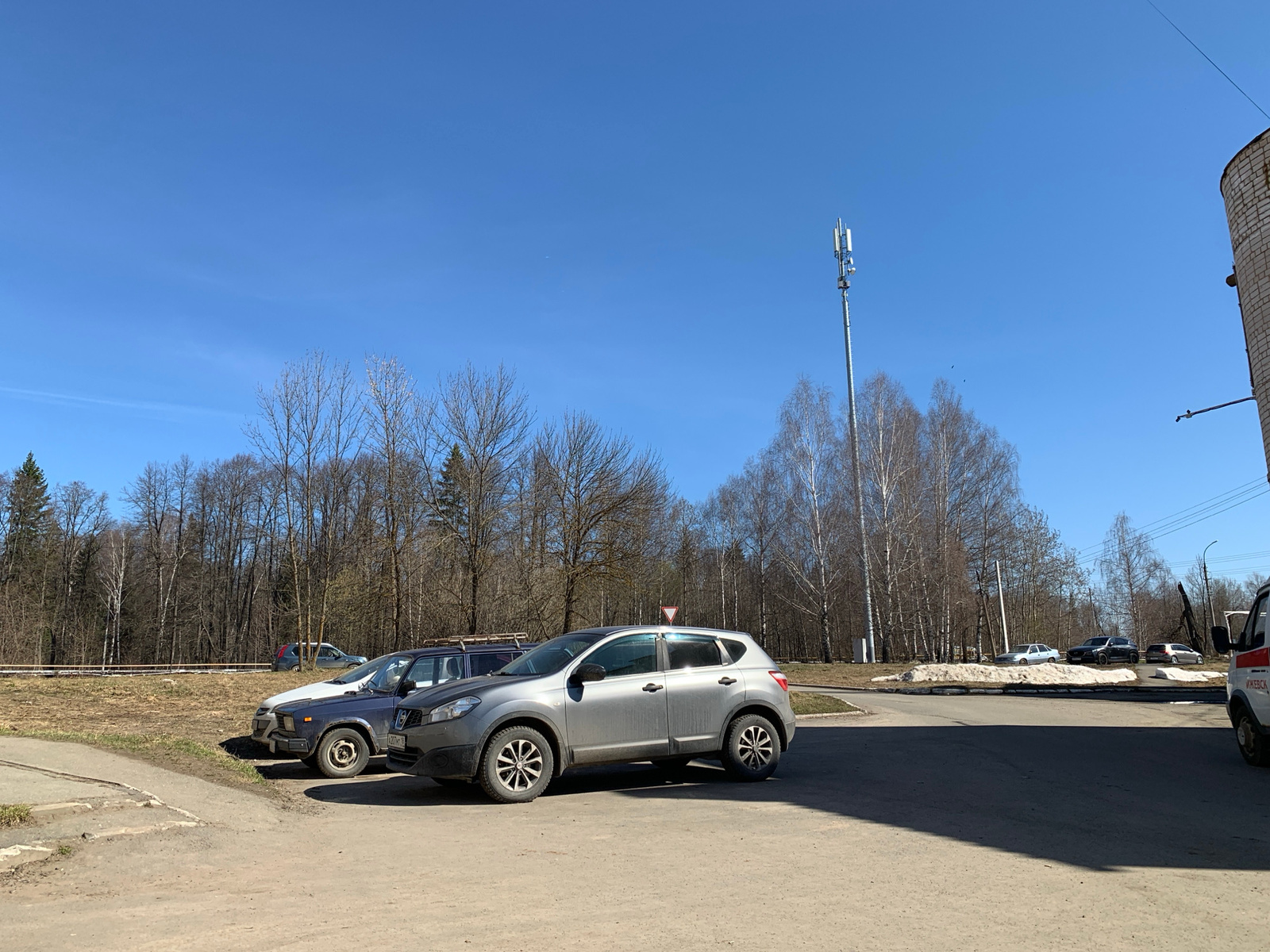 The image presents an outdoor scene in what appears to be a parking area in Varaksino, Russia. The sky is clear and blue. In the foreground, there are two cars parked side-by-side. The car on the righ…read more