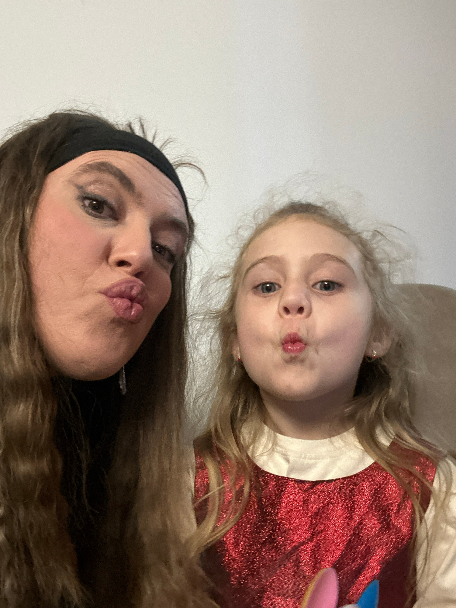 Two people are in the image: a young fair-skinned child with blonde hair and an adult fair-skinned woman with brown hair and a black headband. Both are looking at the camera, and making a kissing face…read more