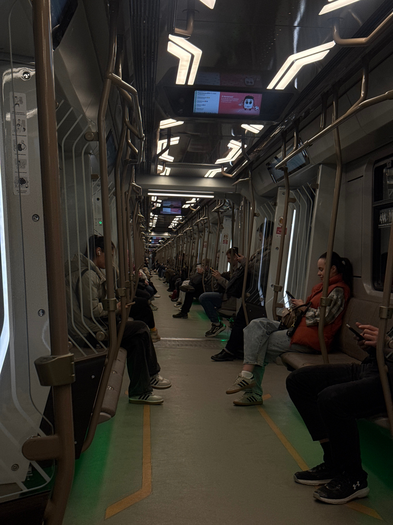The image shows the interior of a Moscow Metro train car, Russia. Passengers are seated along the sides of the train, visible in a line along the right side of the frame. Many are looking at their pho…read more