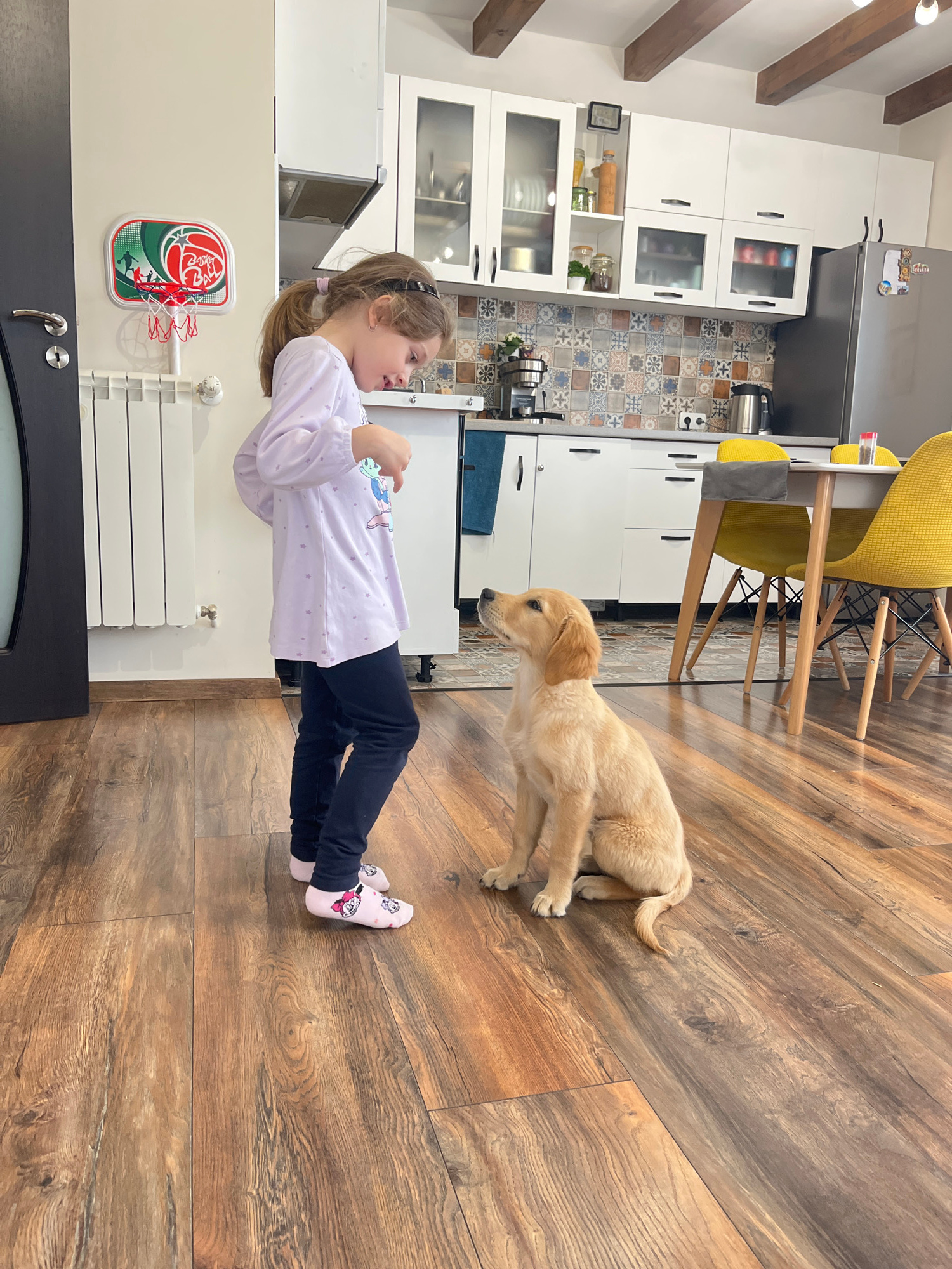 A young girl and a golden retriever puppy are in a kitchen in Kostinbrod, Bulgaria. The girl, with light brown hair pulled back in a ponytail, wears a light purple patterned long-sleeved shirt and dar…read more