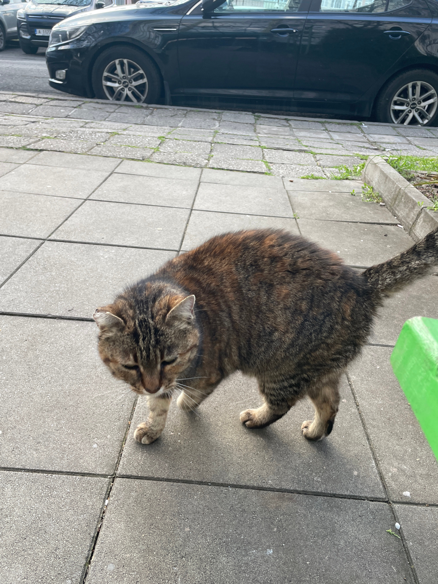 The image depicts a tabby cat lying on a paved sidewalk. The cat is positioned at an oblique angle, with its head near the bottom-center of the frame and its tail extending towards the upper-left. Par…read more