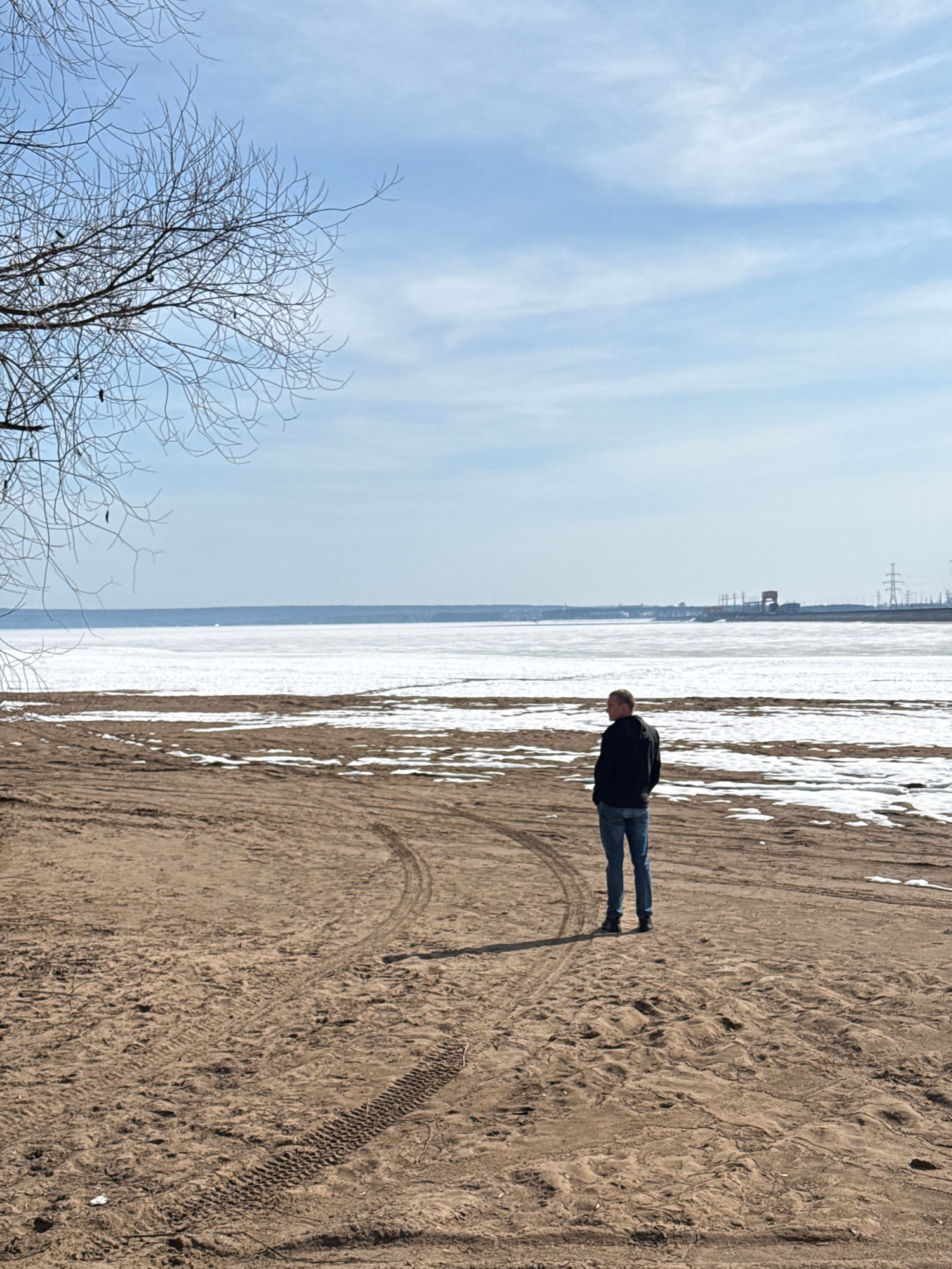 The image depicts a man standing on a sandy beach. The beach is marked with tire tracks and patches of snow. In the background is a frozen body of water, possibly a river or lake, with industrial stru…read more