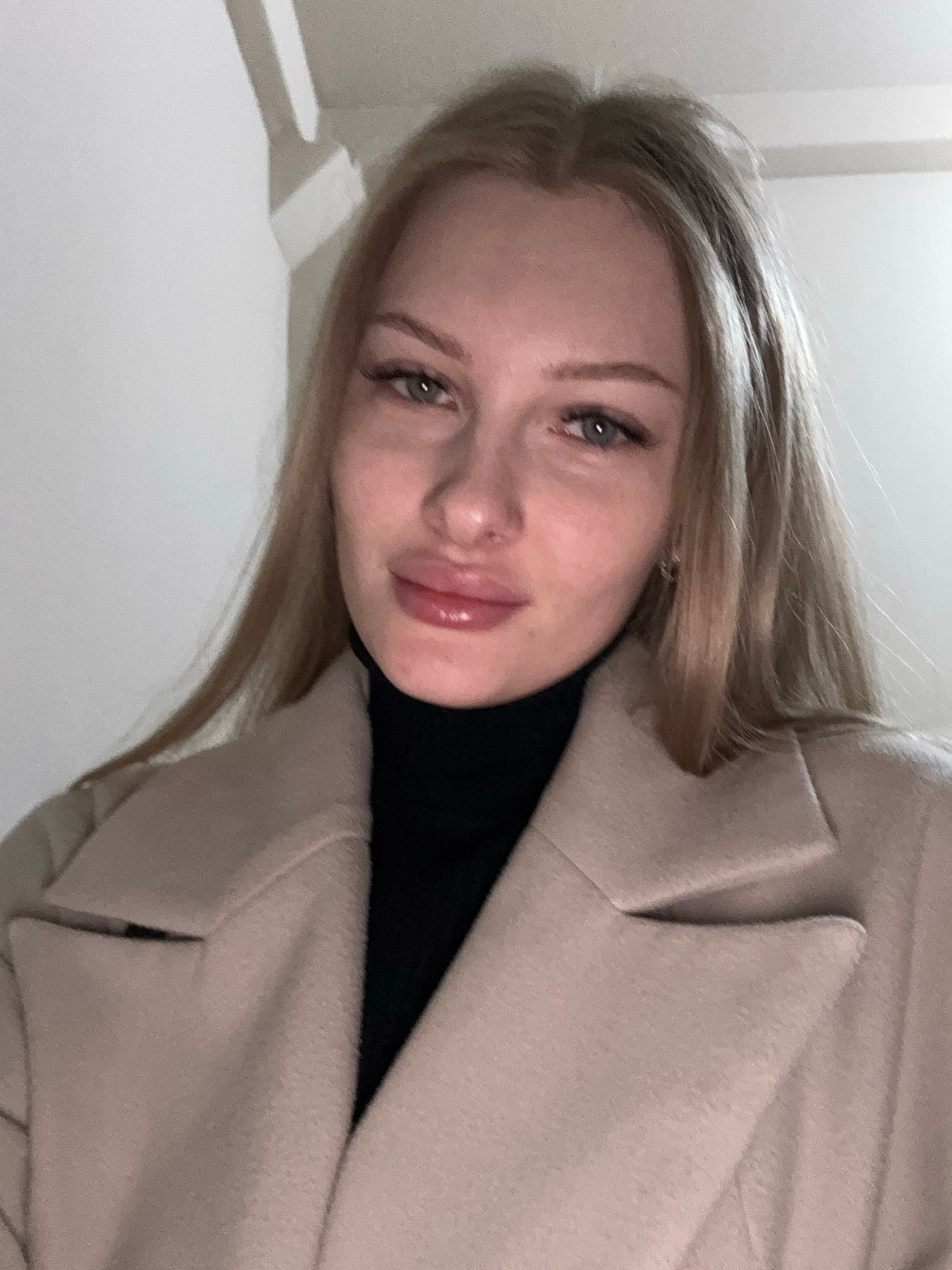 A light-skinned woman with blonde hair, wearing a black turtleneck and a tan-colored coat, poses for a selfie. The background appears to be a white or light-colored wall or interior surface. It is not…read more