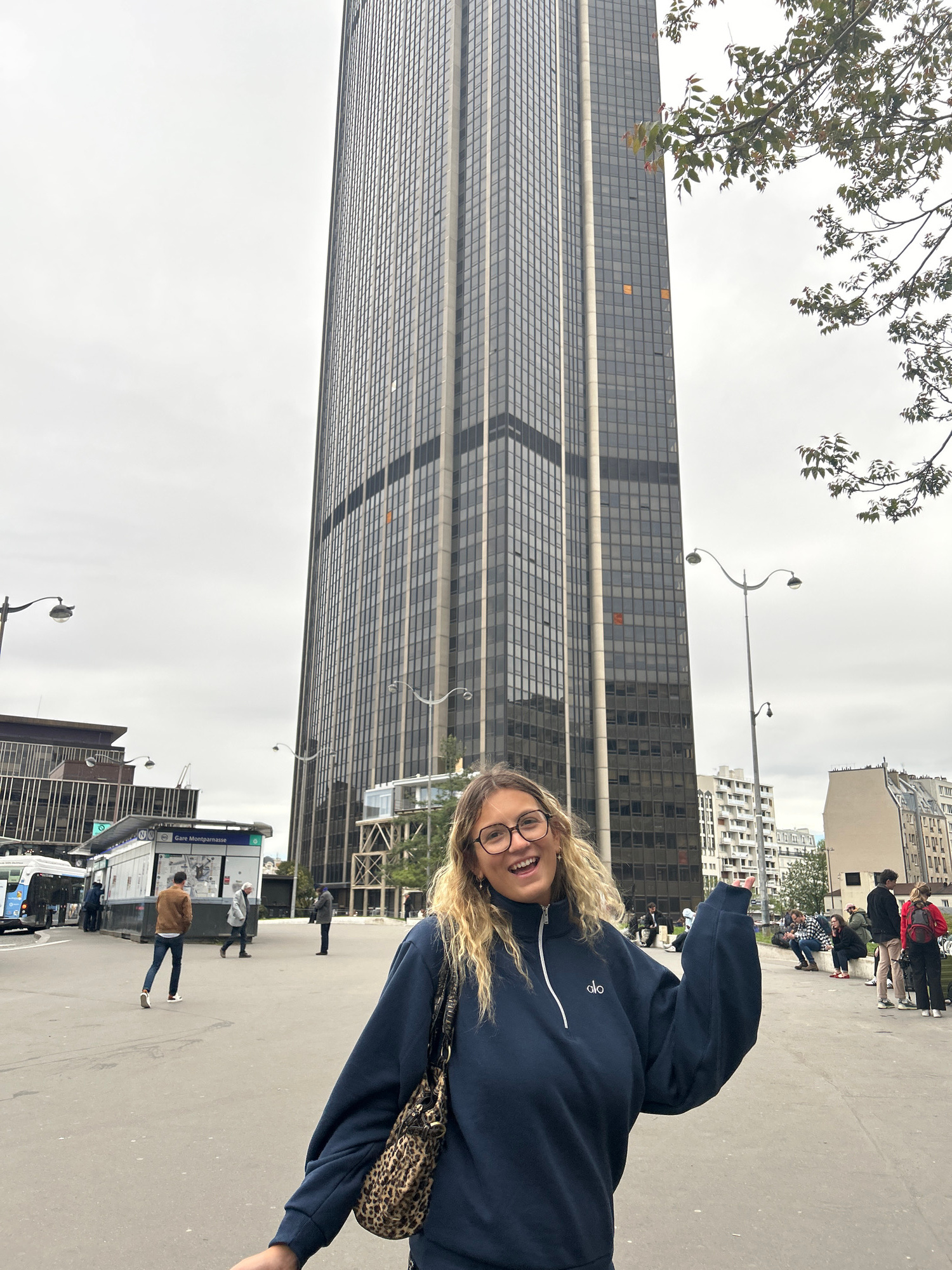 A woman stands on a city street with the Montparnasse Tower in Paris, France in the background. She wears a navy blue zip-up sweatshirt and glasses. The street is crowded with pedestrians. Public tran…read more