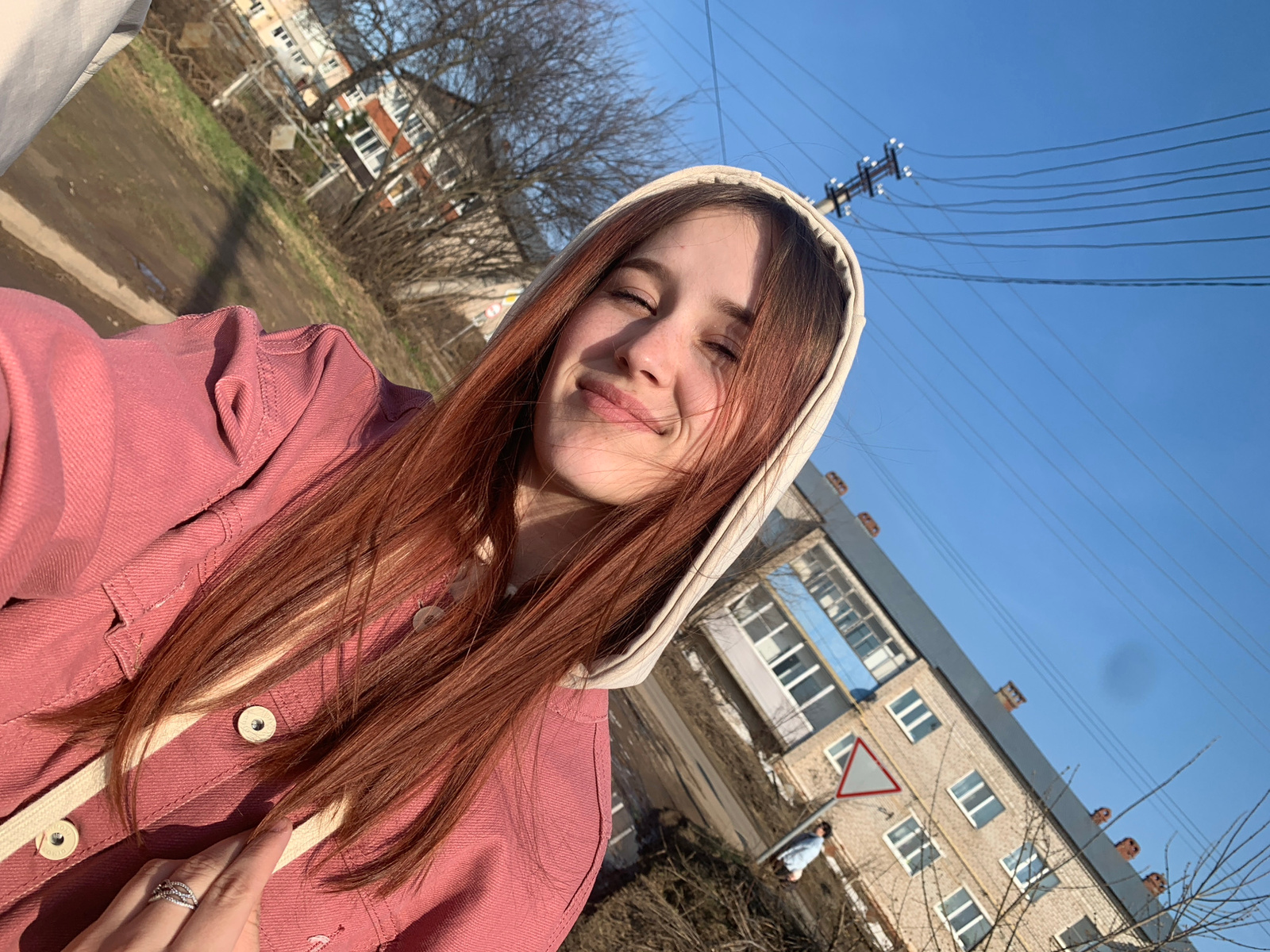 A young woman is photographed in a selfie, outside in Фоки, Russia. The perspective is low and upward, the camera tilted. She wears a pink hooded jacket with a cream-colored hood lining and drawstring…read more